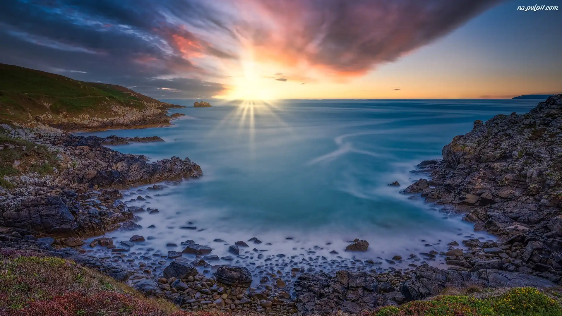 Bretania, Zatoka, Pointe du Millier, Przylądek, Skały, Wschód słońca, Chmury, Morze, Francja, Wybrzeże Na Pulpit |
