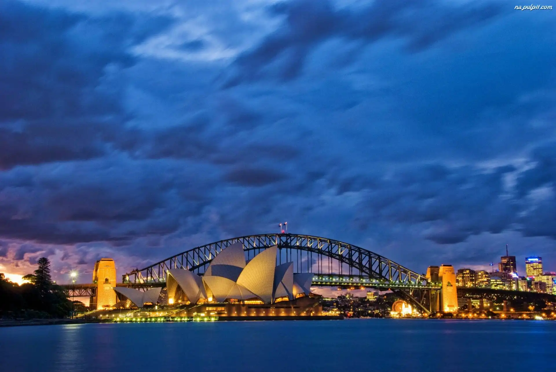 Sydney, Most Sydney Harbour Bridge, Miasto nocą, Zatoka Port Jackson, Australia, Sydney Opera House Na Pulpit |