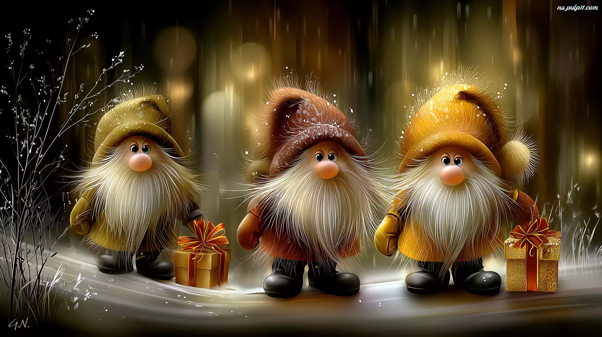 Prezenty, Trzy, Długie, Brody, Skrzaty, Grafika AI Na Pulpit