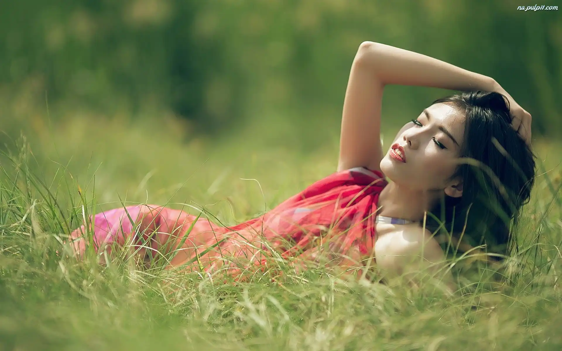 Łąka, Czerwona, Brunetka, Sukienka