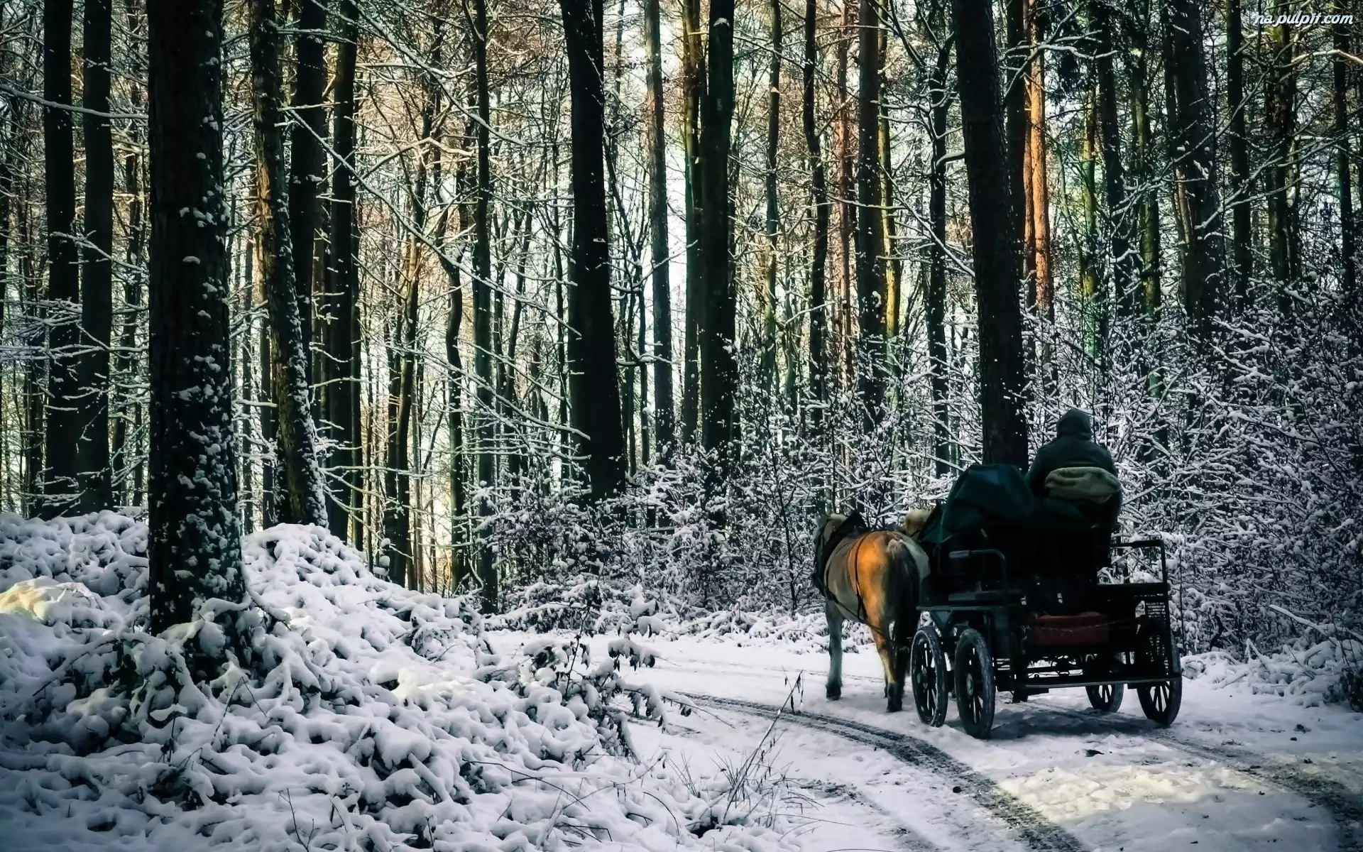 Bryczka, Droga, Zima, Ludzie, Las, Konie Na Pulpit