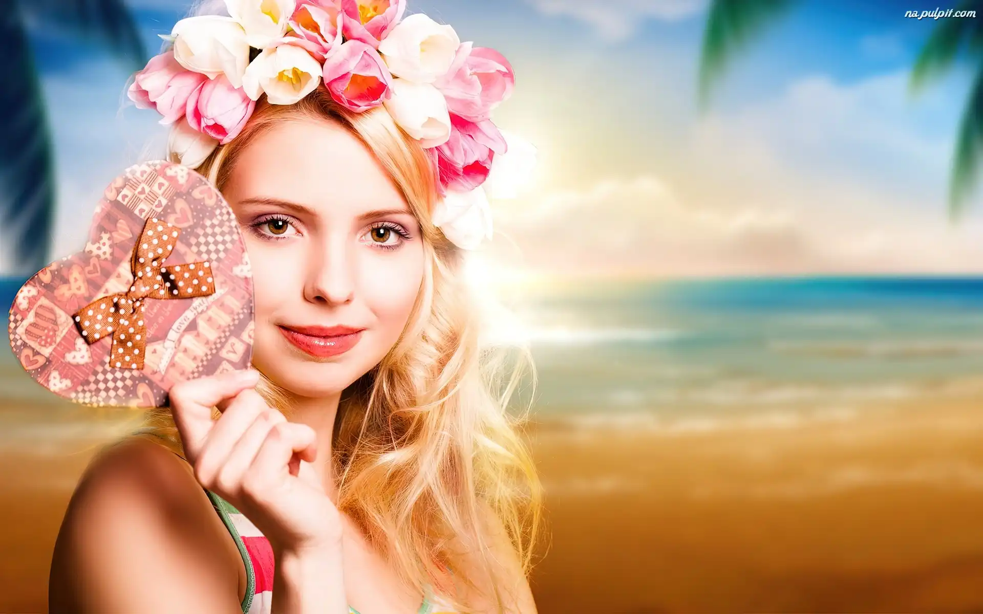 Brzeg, Kwiaty, Serce, Kobieta, Morze, Wianek