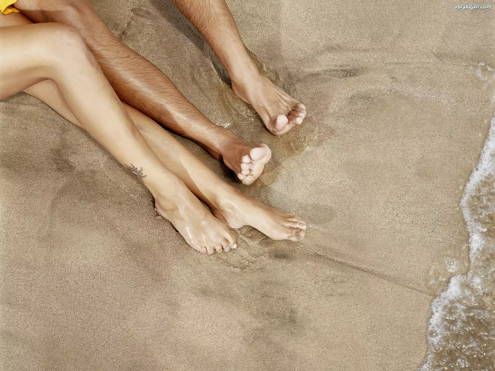 Brzeg, Mężczyzna, Kobieta, Nogi, Piasek