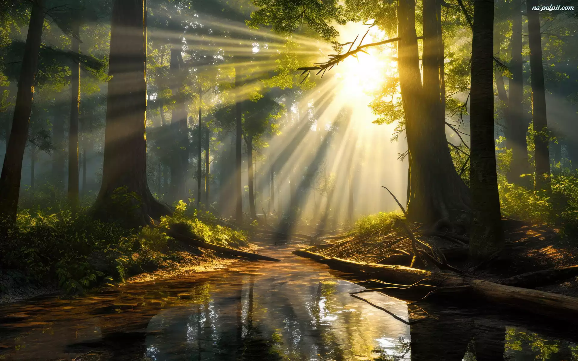 Brzeg, Poranek, Słońce, Drzewa, Gałęzie, Przebijające światło, Las, Strumień, Mgła Na Pulpit |
