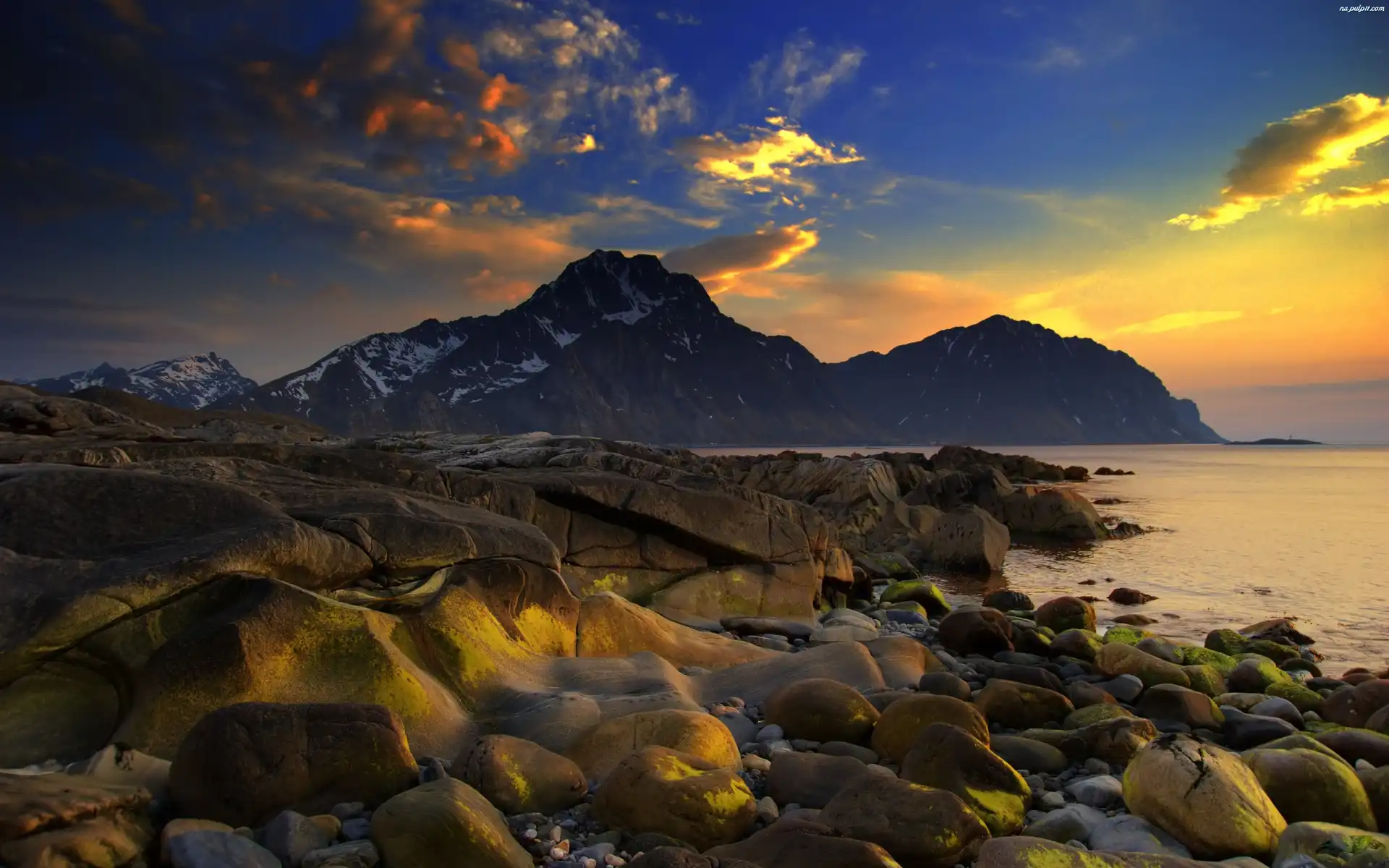 Brzeg, Skały, Słońca, Zachód, Kamienisty