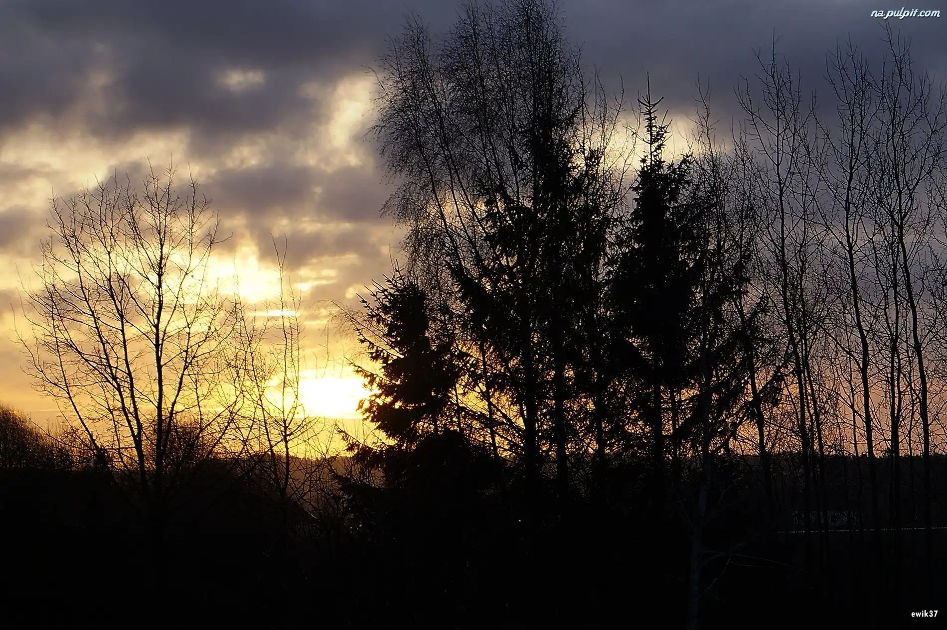Brzozy, Słońce, Niebo, Fioletowe, Choinki