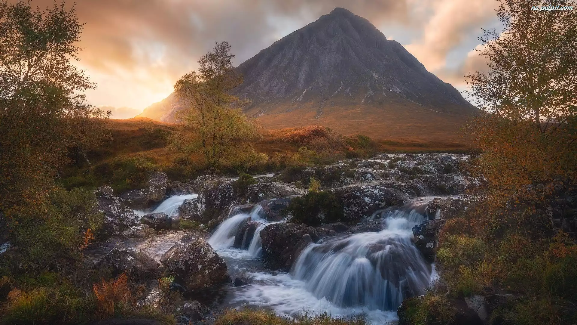 Drzewa, Góra, Szkocja, Jesień, Dolina, Skały, Zachód słońca, Buachaille Etive Mor, Glen Coe, Rzeka Na Pulpit |