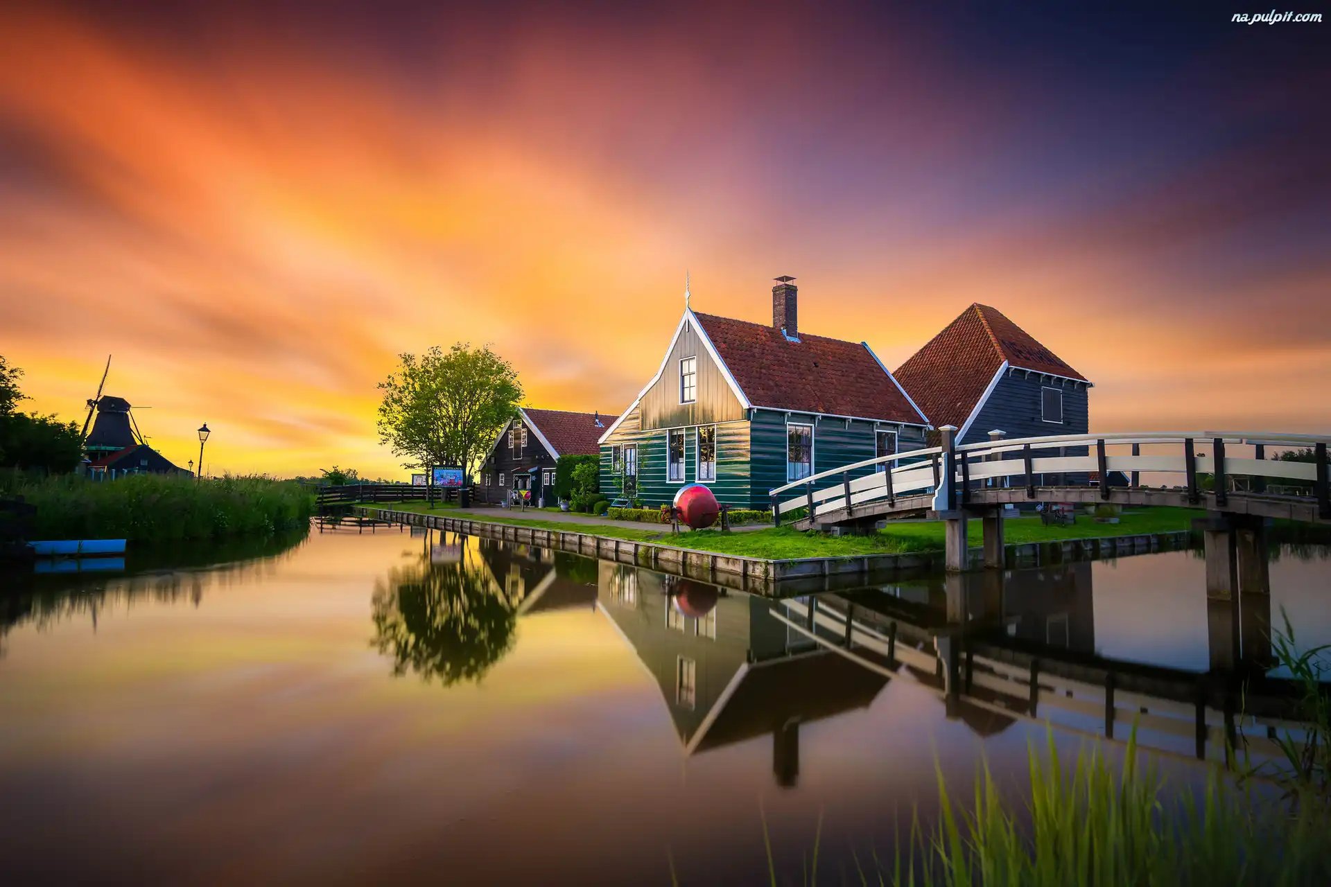 Domy, Skansen Zaanse Schans, Zachód słońca, Most, Rzeka, Holandia, Budynki Na Pulpit