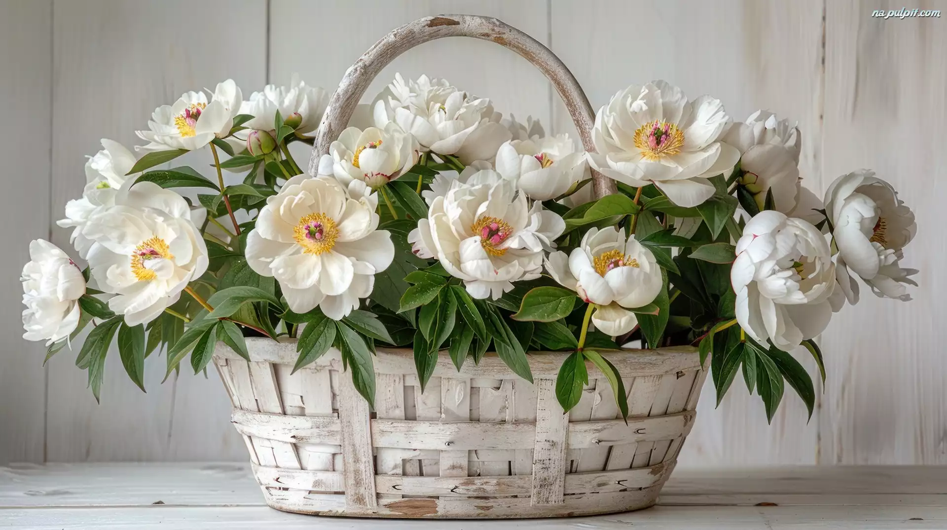 Piwonie, Bukiet, Białe, Koszyk, Kwiaty Na Pulpit