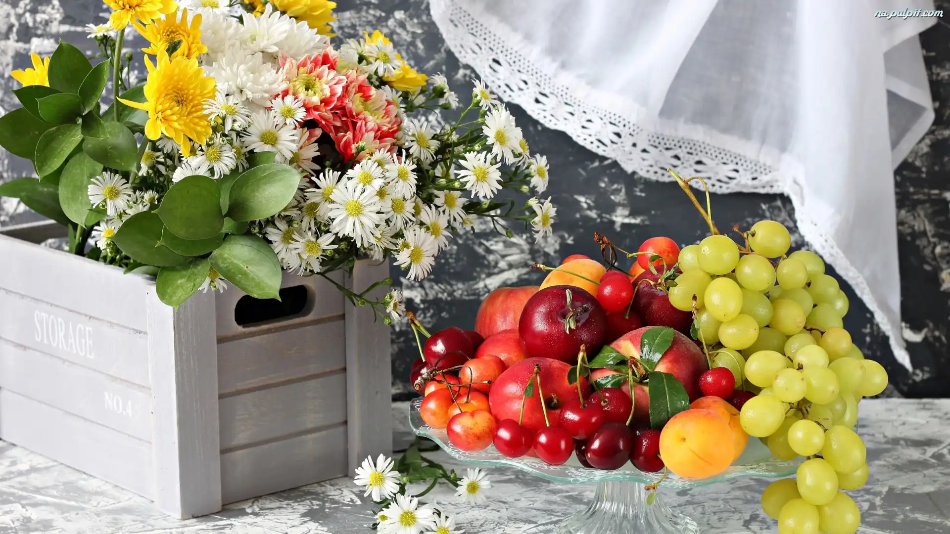 Czereśnie, Bukiet, Winogrono, Skrzynka, Kwiaty, Kompozycja, Owoce Na Pulpit