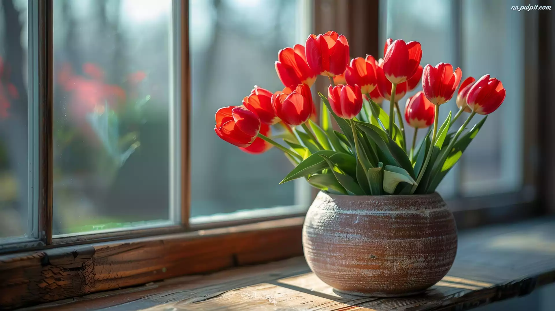 Wazon, Bukiet, Czerwone, Okno, Tulipany Na Pulpit