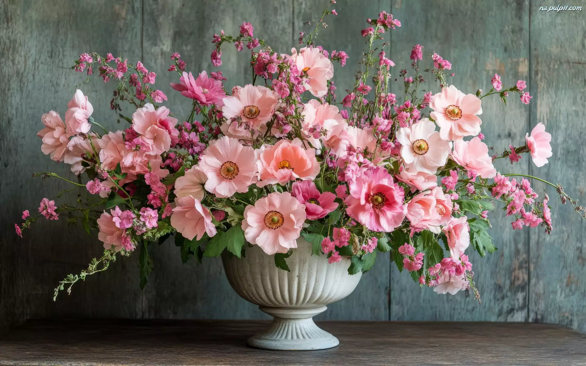 Waza, Kwiaty, Zawilce, Bukiet, Różowe, Deski