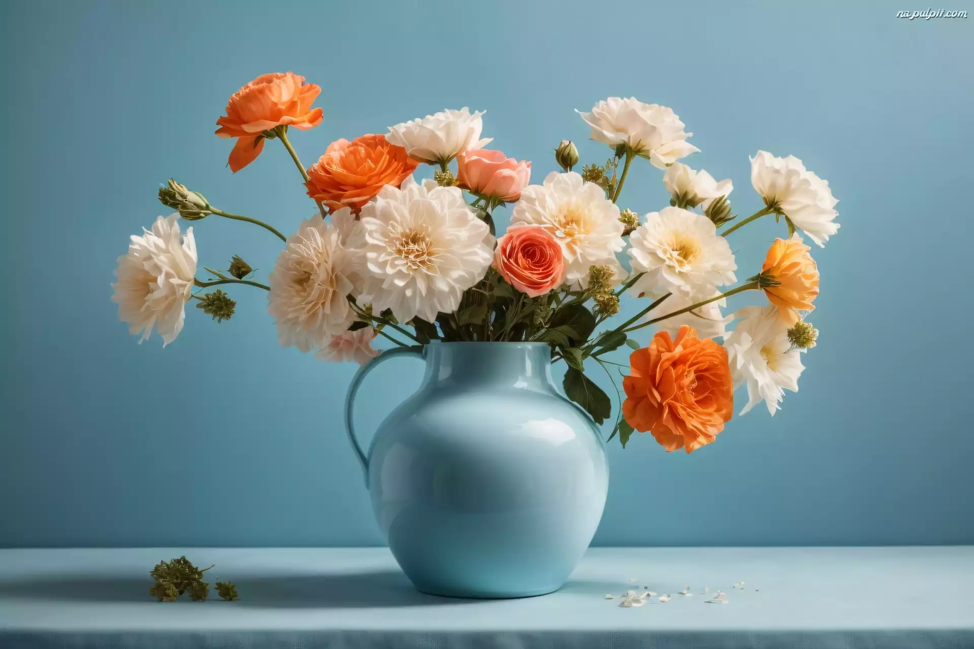 Niebieski, Kwiaty, Pomarańczowe, Bukiet, Białe, Dzbanek