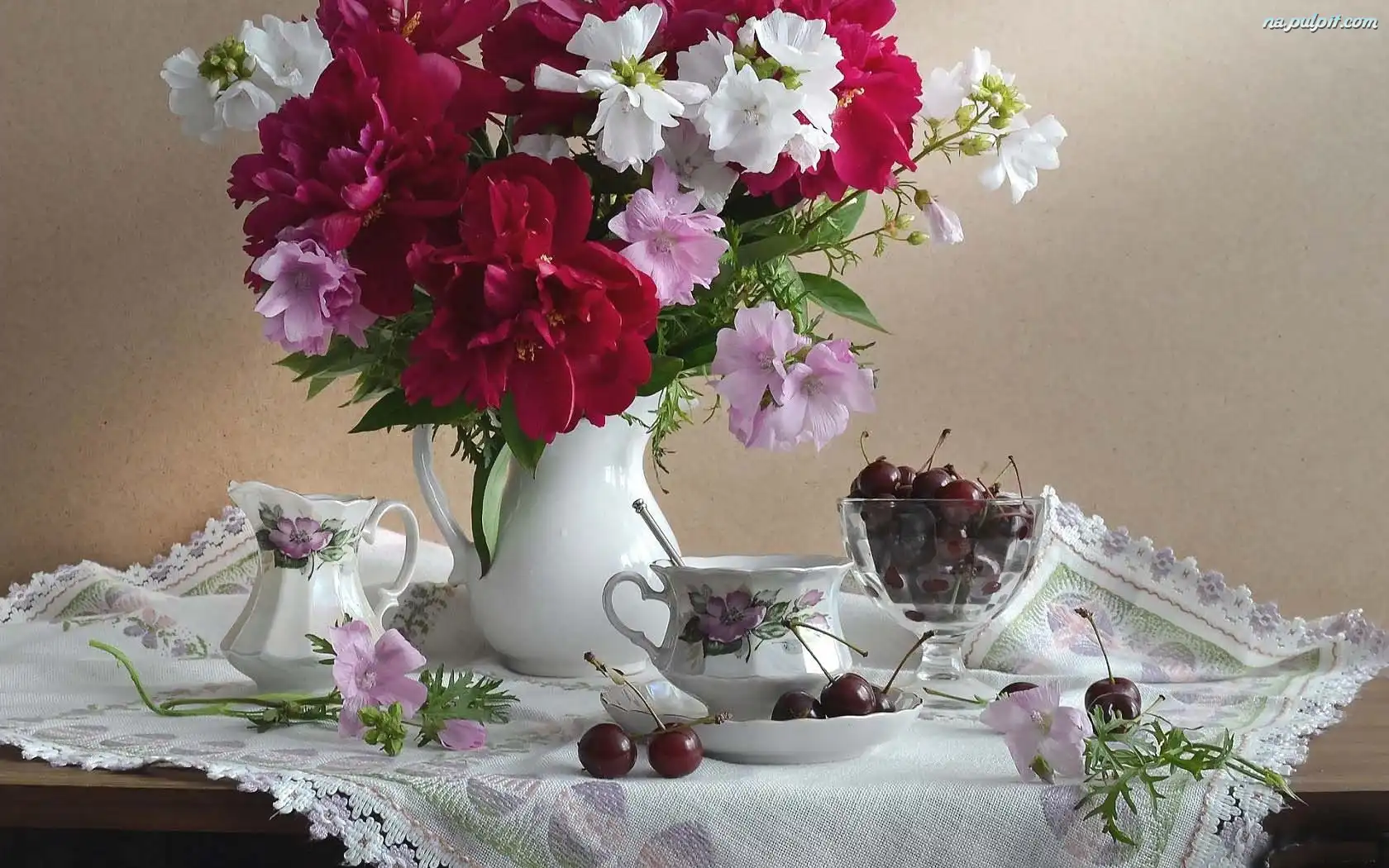 Dzbanuszek, Bukiet, Wazon, Piwonie, Kwiatów, Kompozycja, Czereśnie Na Pulpit