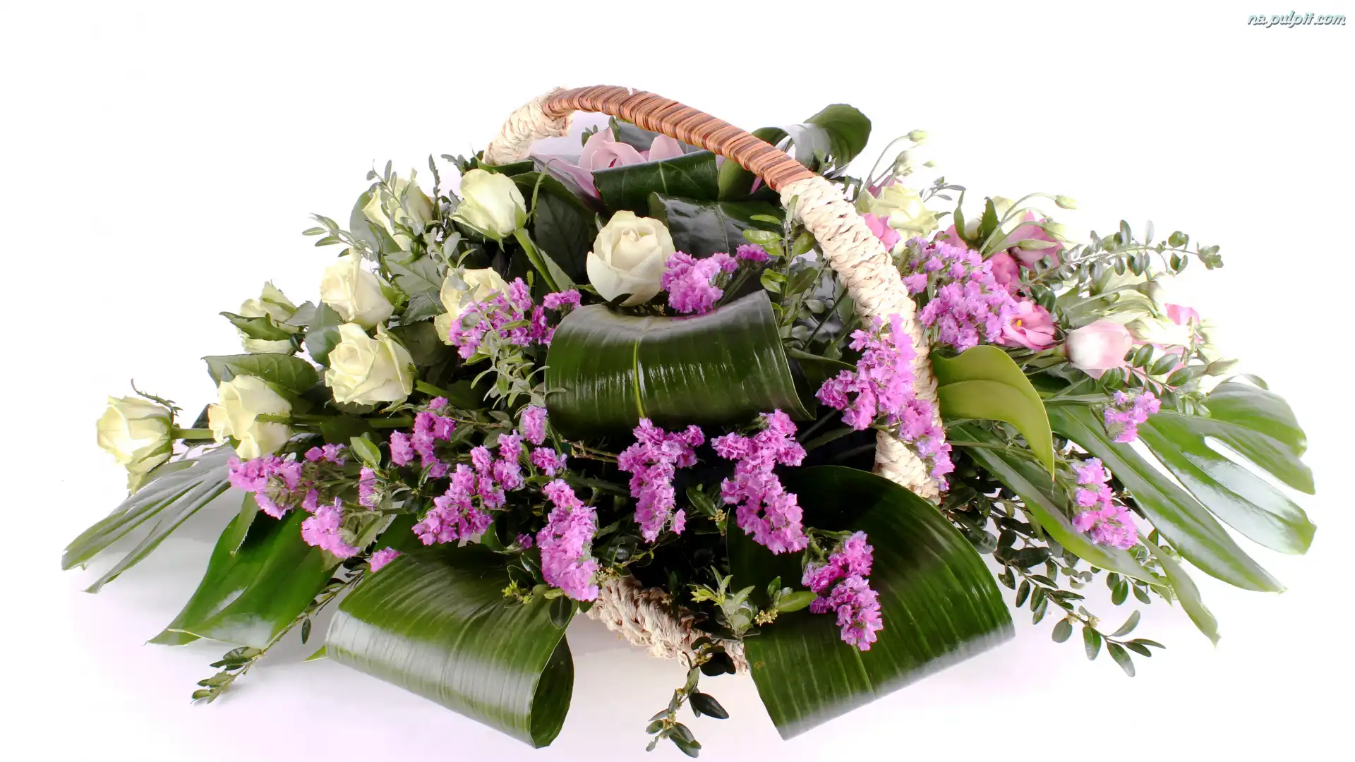 Bukiet, Liście, Koszyk, Róże, Kwiaty, Zatrwian Na Pulpit