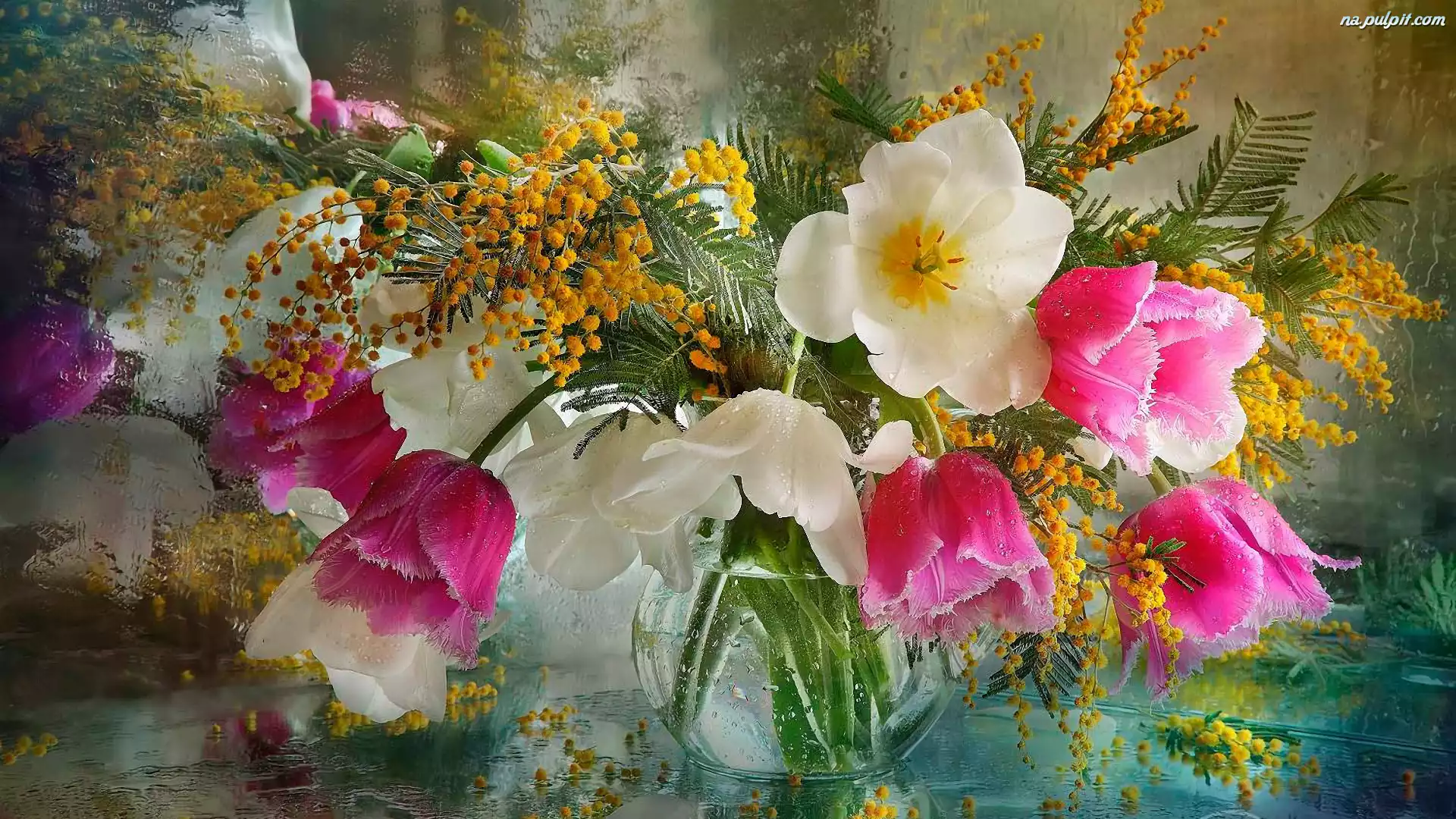 Bukiet, Akacja srebrzysta, Tulipany, Kwiaty, Wazon Na Pulpit