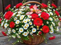 Deski, Wiklinowy, Kwiaty, Bukiet, Czerwone, Białe, Koszyk