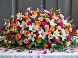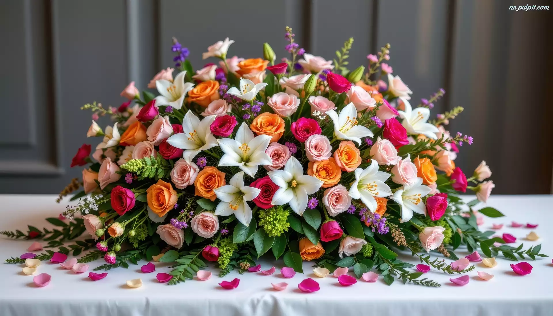 Stół, Lilie, Róże, Bukiet, Kolorowe, Kwiaty, Płatki Na Pulpit