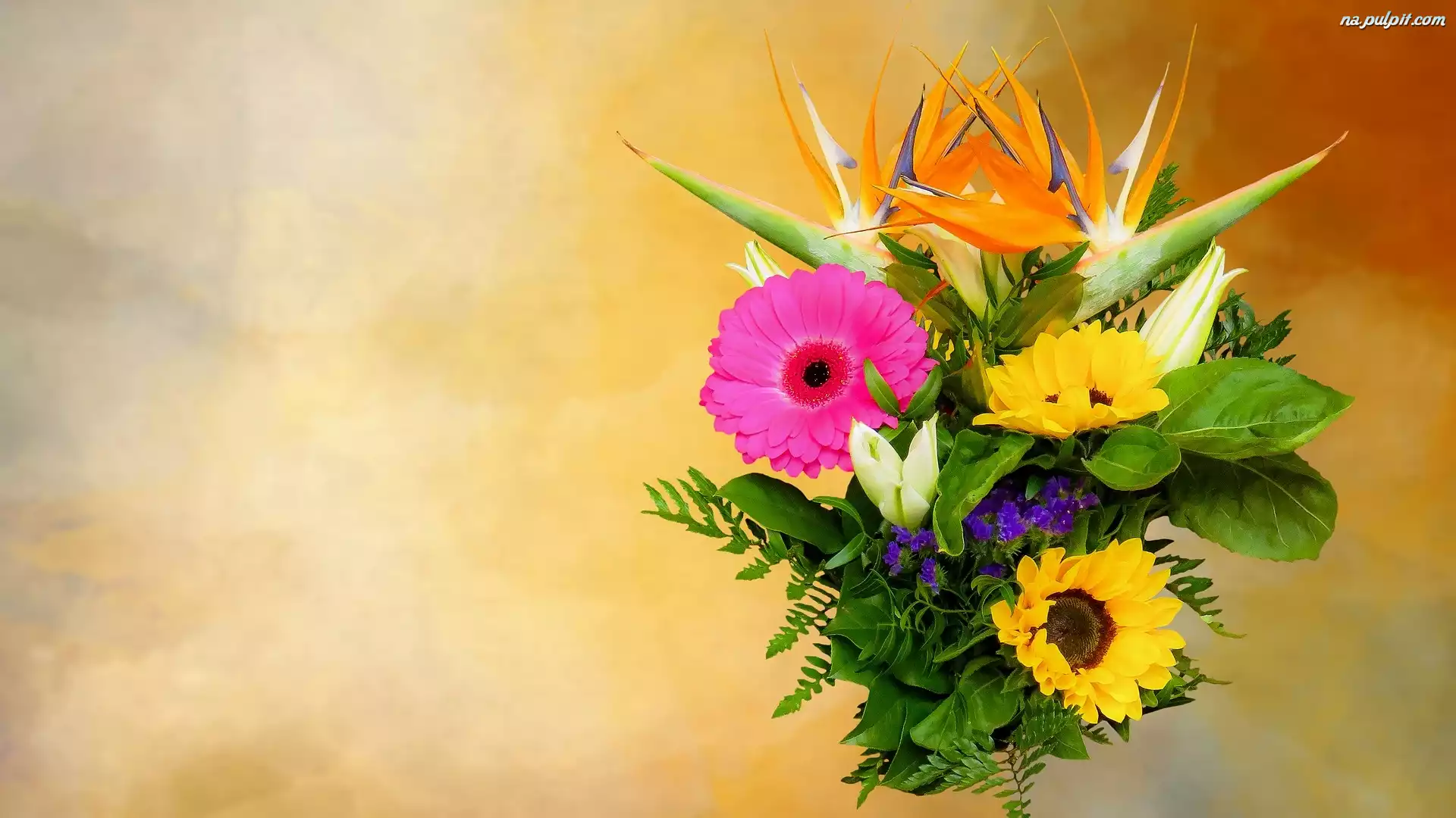 Tło, Bukiet, Żółte, Słoneczniki ozdobne, Gerbera, Kwiaty, Strelicje Na Pulpit