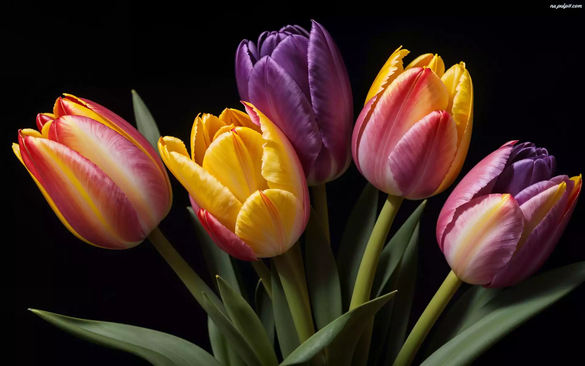 Tulipany, Kolorowe, Liście, Bukiet Na Pulpit