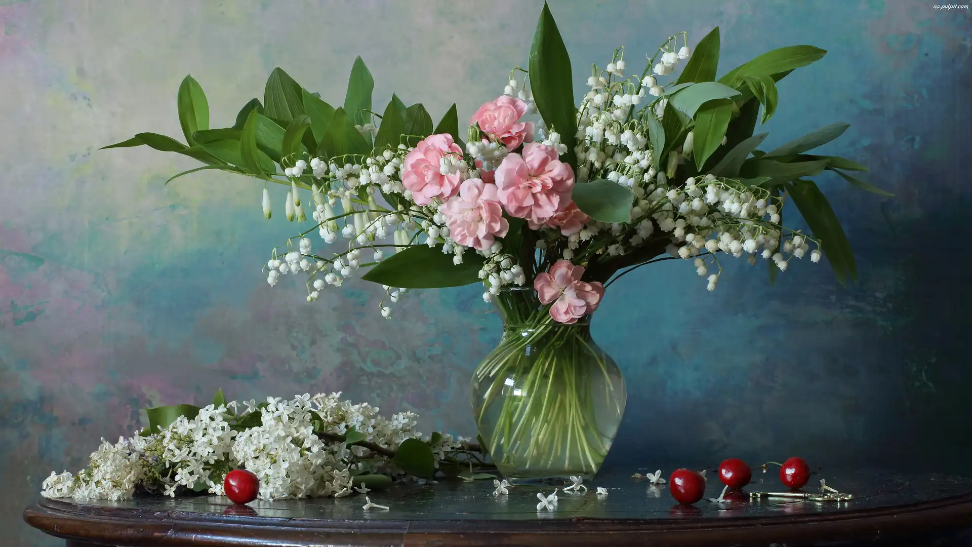 Wazon, Bukiet, Szklany, Konwalie, Goździki, Kwiaty, Bez Na Pulpit