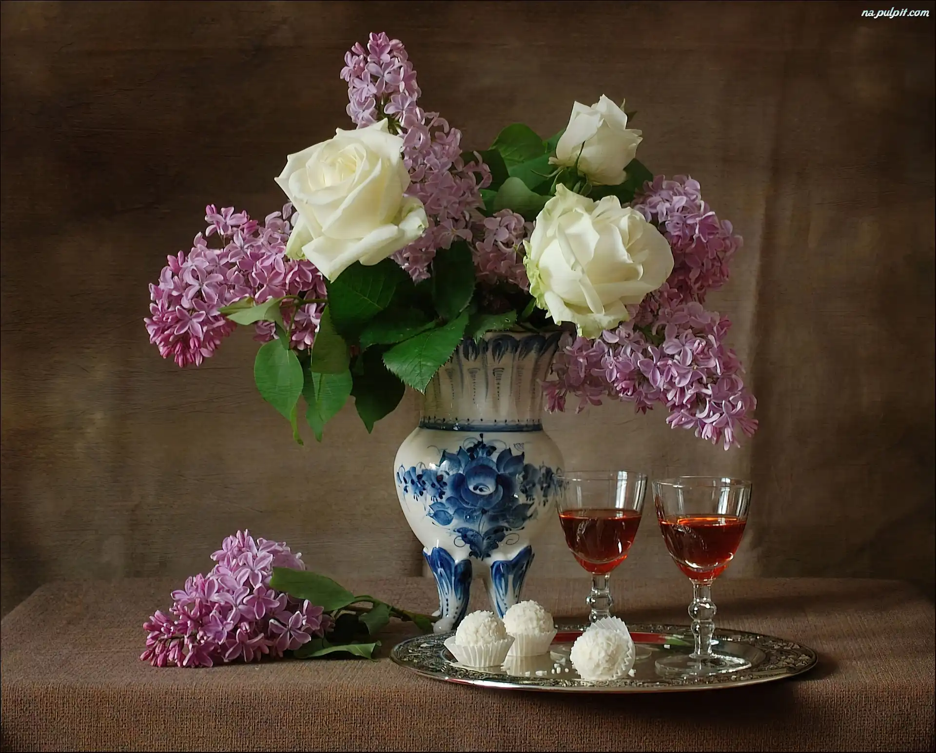 Bukiet, Białych, Róż, Fioletowego, Wazon, Bzu Na Pulpit