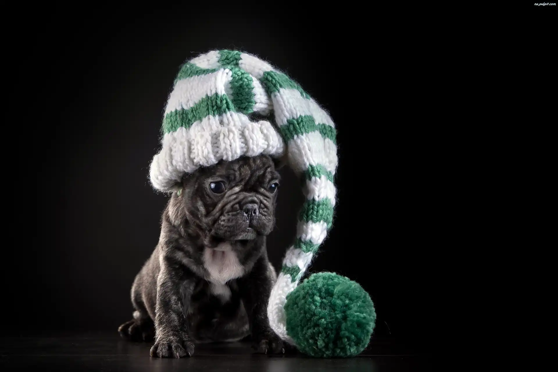 Dzianina, Buldog francuski, Pompon, Zimowa, Szczeniak, Pies, Czapka Na Pulpit