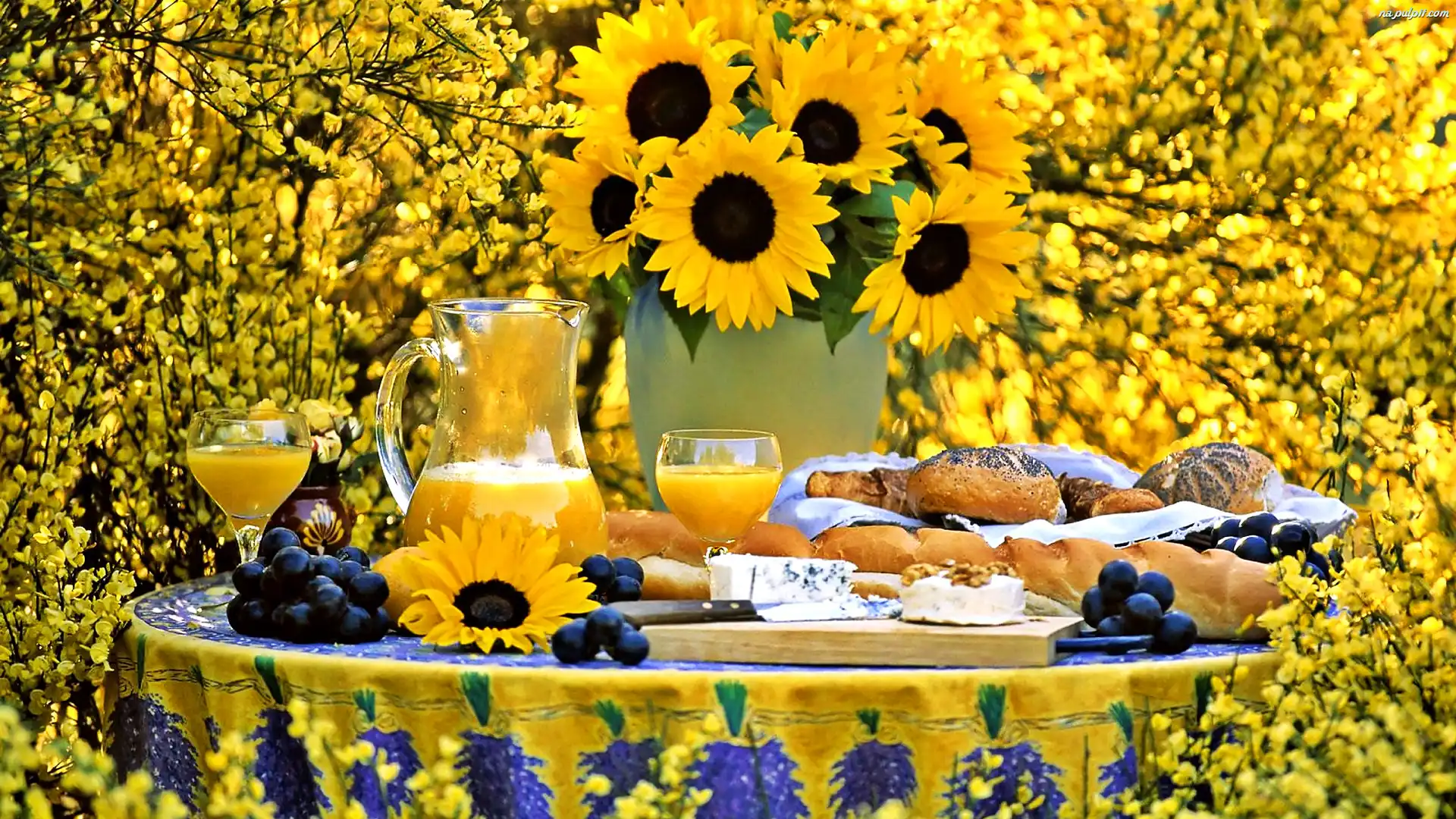 Bułeczki, Zastawiony, Stół, Sok, Słoneczniki, Ser Na Pulpit