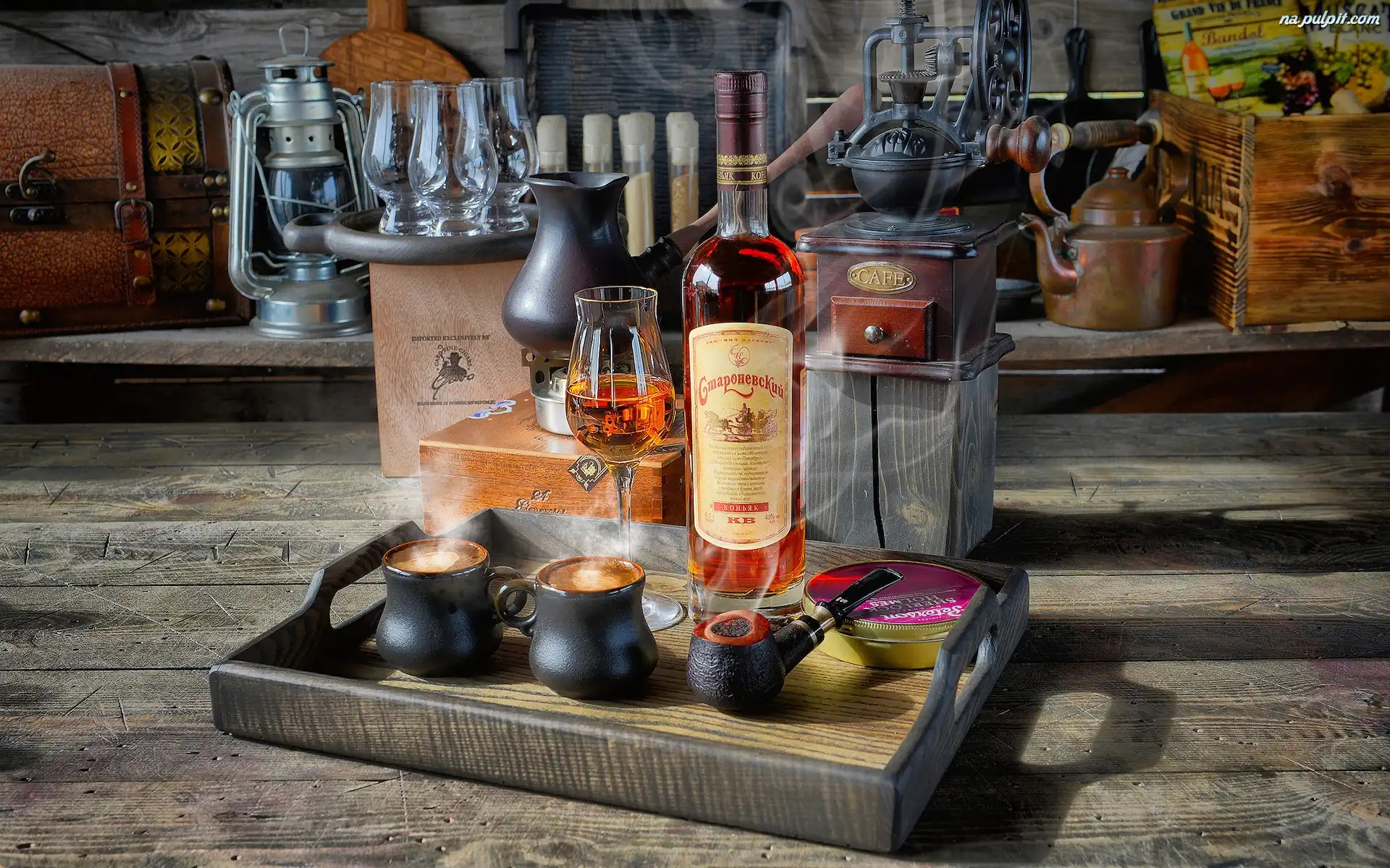 Kawa, Butelka, Koniak, Młynek, Lampa, Kieliszek, Kompozycja, Taca Na Pulpit