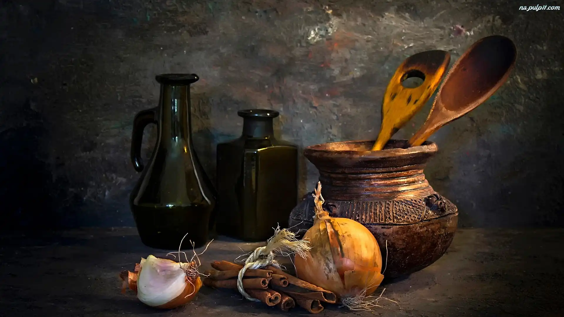 Butelki, Drewniane, Czosnek, Cebula, Łyżki