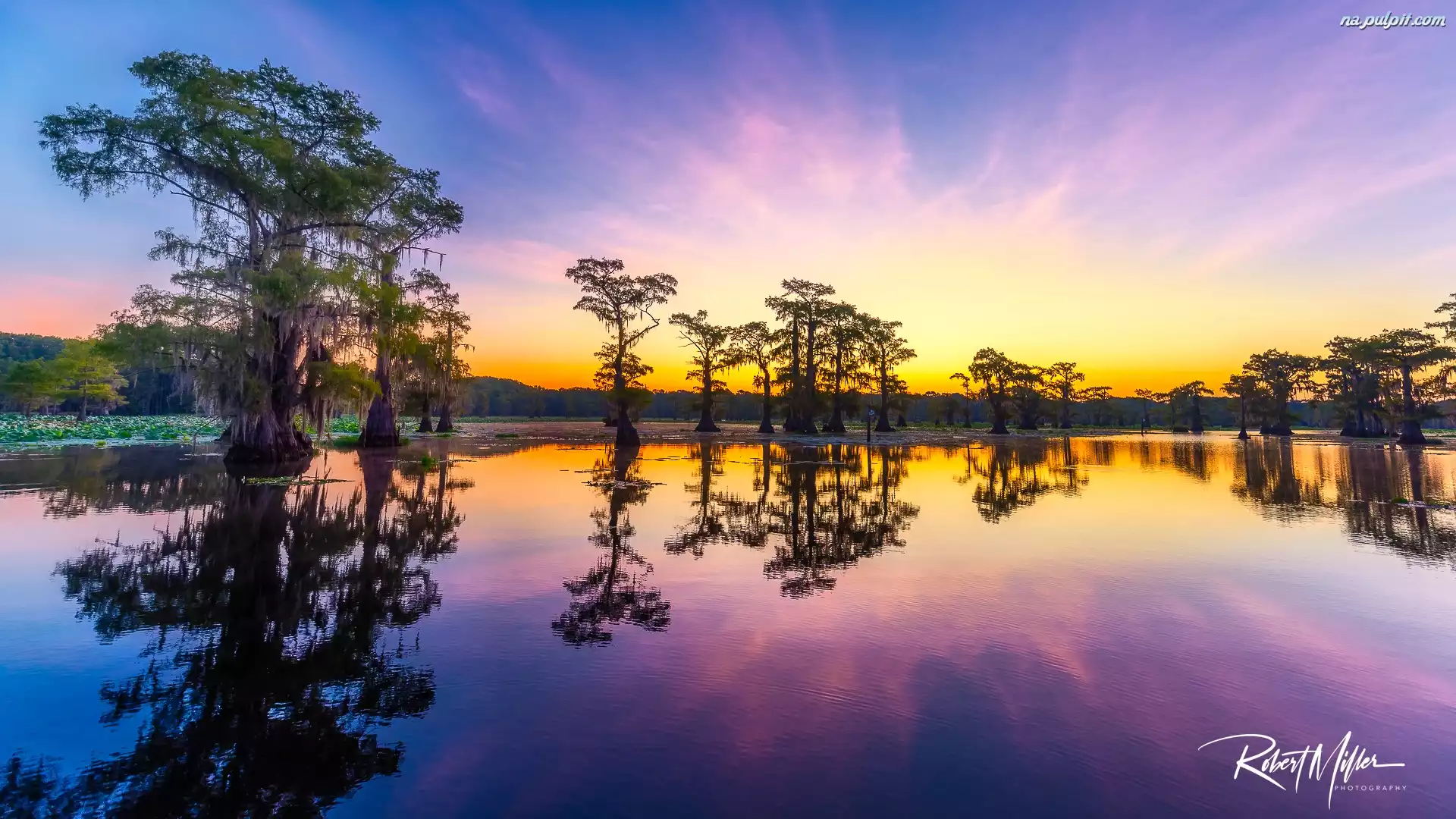 Stany Zjednoczone, Wschód słońca, Cyprysy, Jezioro, Caddo Lake, Drzewa, Stan Teksas Na Pulpit