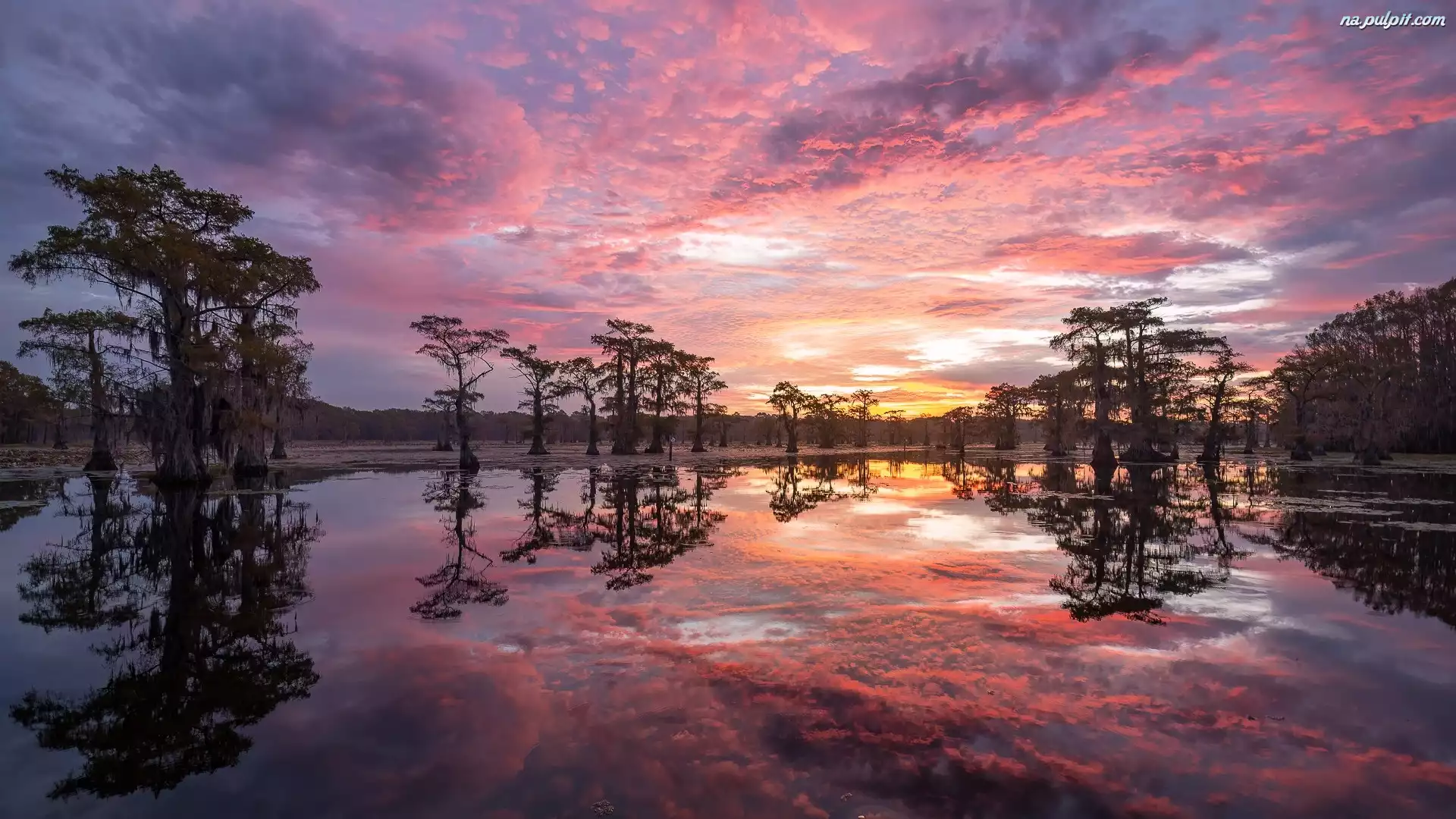 Zachód słońca, Las, Chmury, Jezioro, Stany Zjednoczone, Stan Teksas, Caddo Lake, Drzewa Na Pulpit |