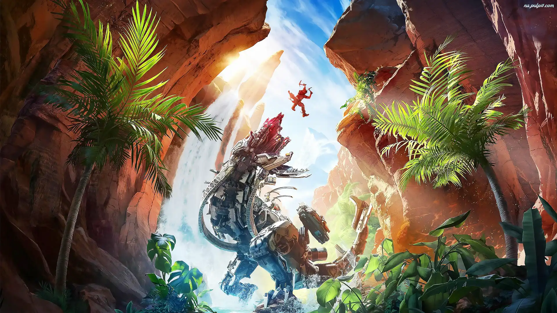 Postać, Skok, Horizon Call of the Mountain, Rośliny, Góry, Palmy, Gra, Cyberpotwór, Wodospad Na Pulpit |