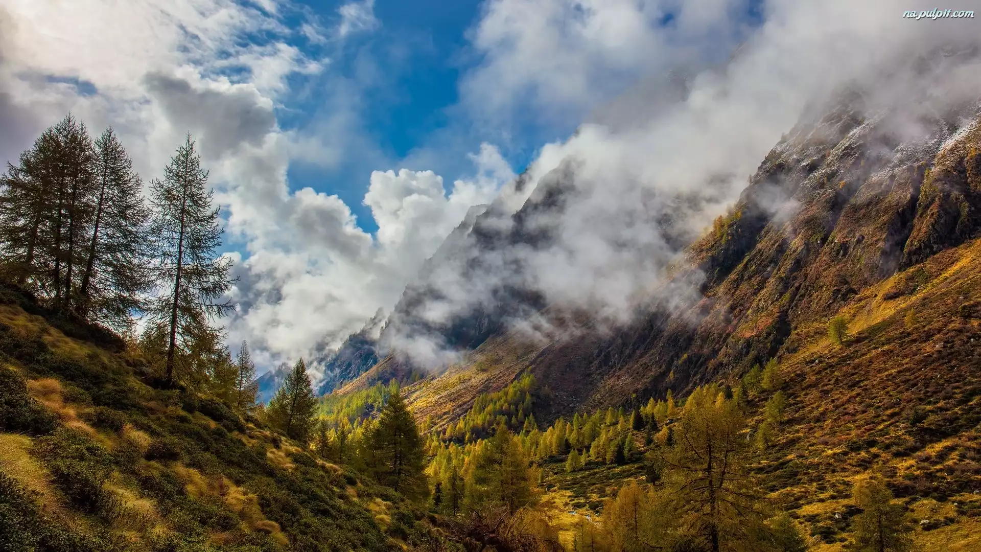 Włochy, Rośliny, Drzewa, Jesień, Góry, Chmury, Val Cane Na Pulpit