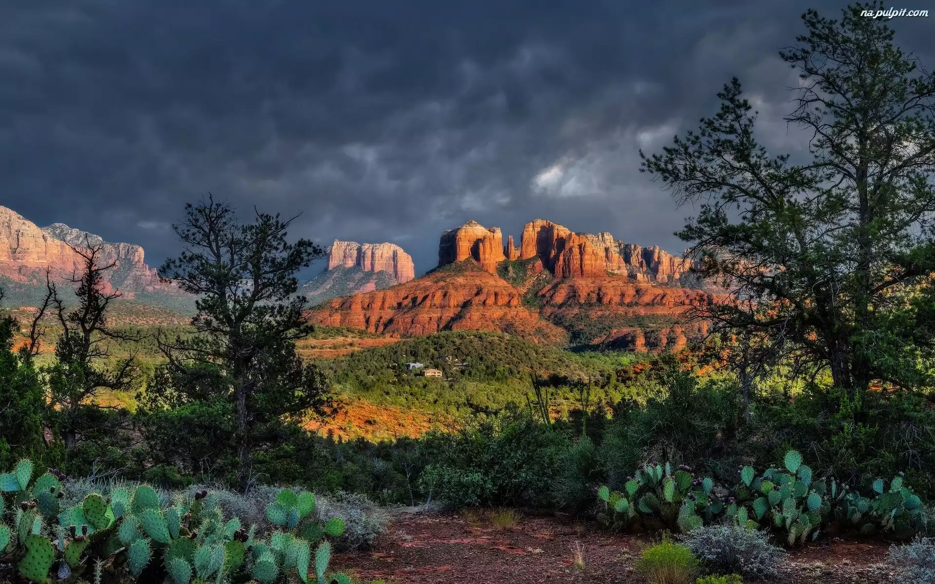 Cathedral Rock, Sedona, Drzewa, Stany Zjednoczone, Kaktusy, Chmury, Arizona, Skały Na Pulpit