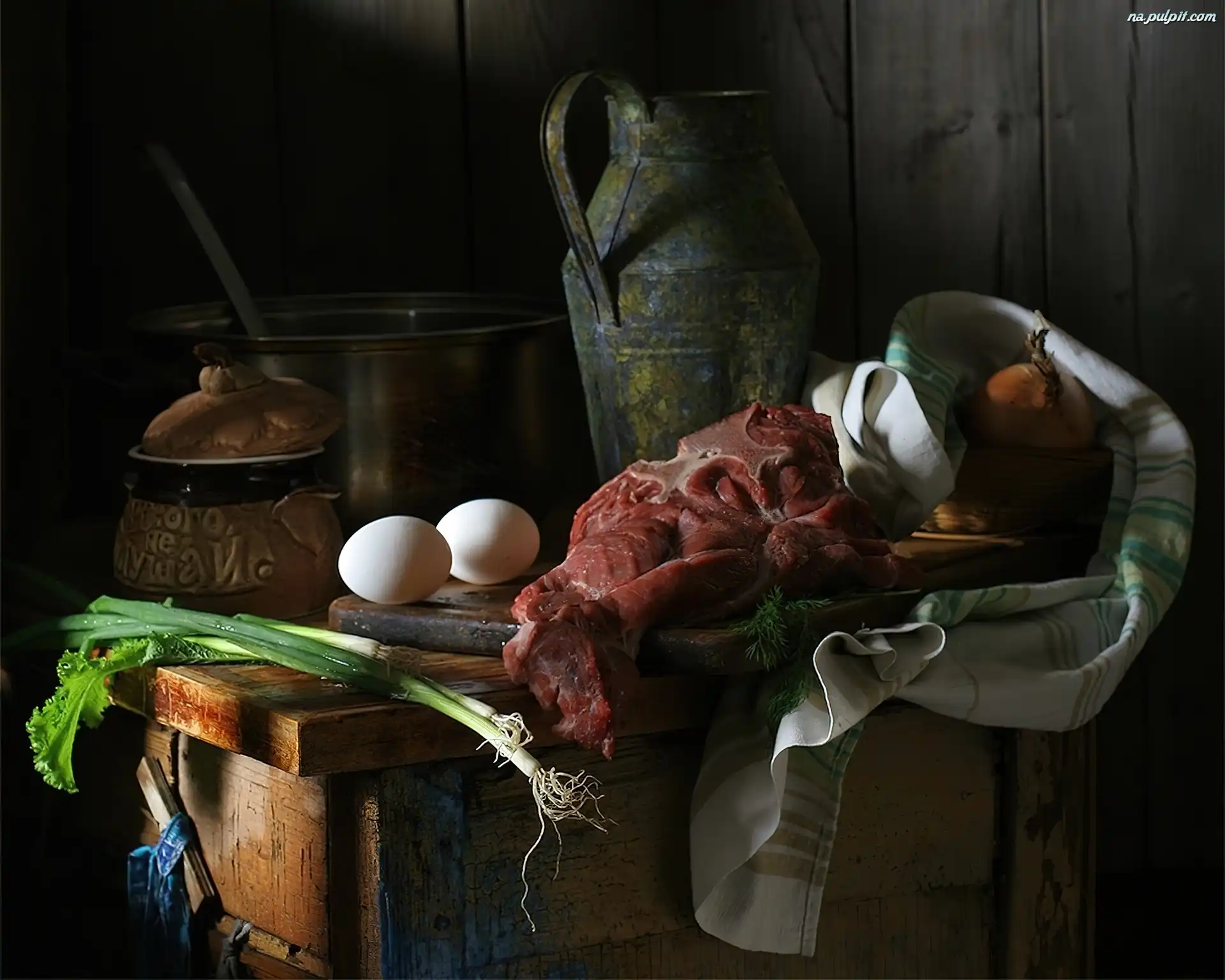 Cebulka, Stare, Jajka, Mięso, Garnki