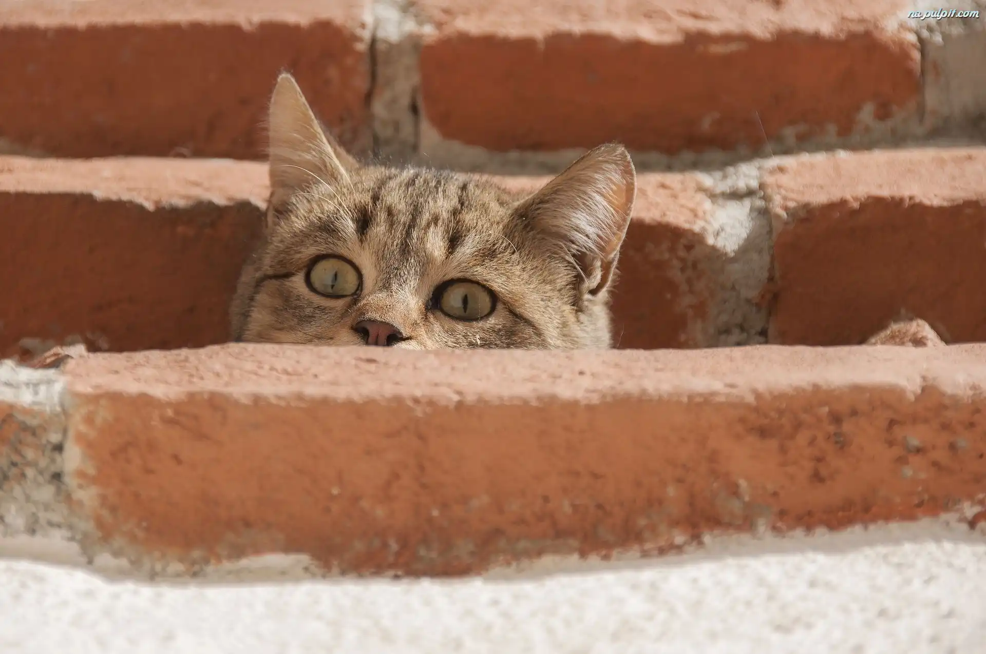 Cegły, Spojrzenie, Kot, Bury, Wystraszony