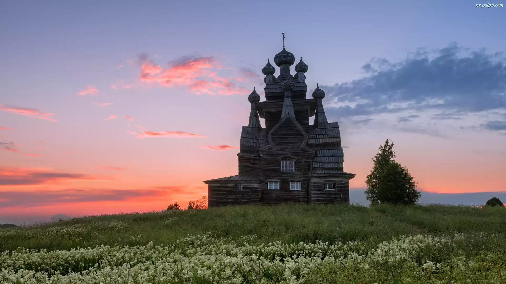Łąka, Cerkiew, Drzewo, Kwiaty, Wzgórze Na Pulpit