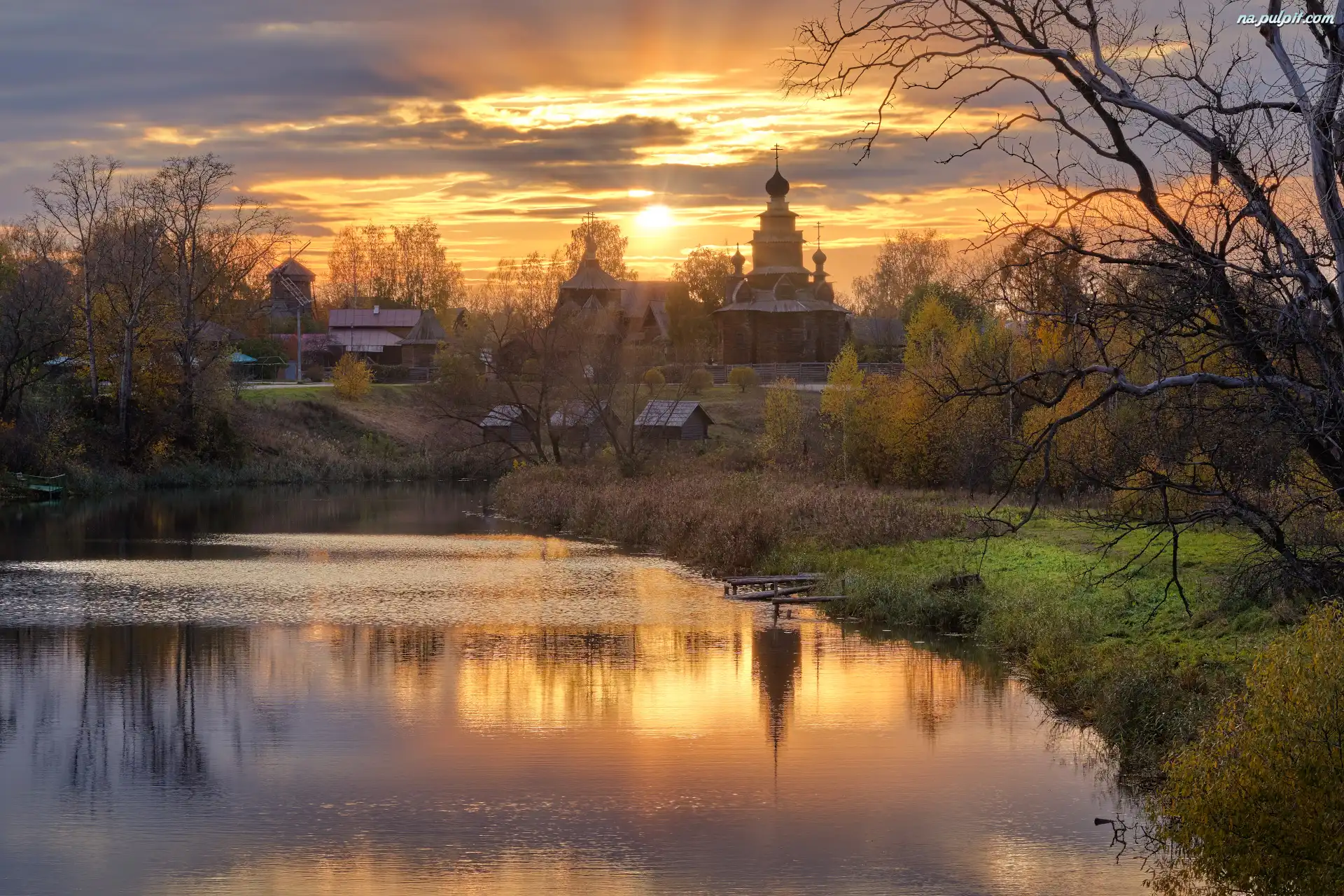 Suzdal, Jesień, Cerkiew, Obwód włodzimierski, Rosja, Drzewa, Zachód słońca, Rzeka Kamienka Na Pulpit |