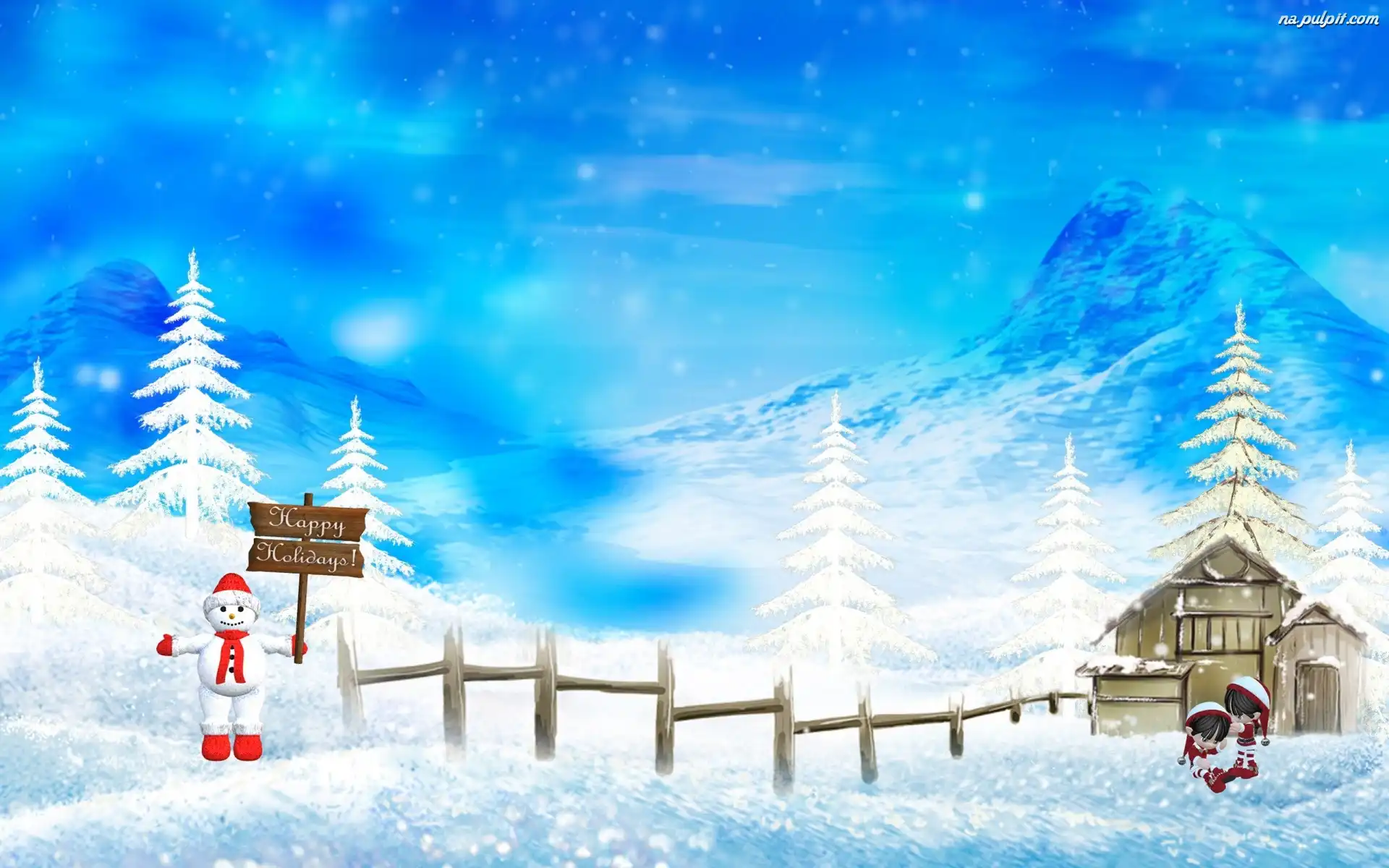 Chatka, Śnieg, Bałwanek, Święta, Choinki Na Pulpit