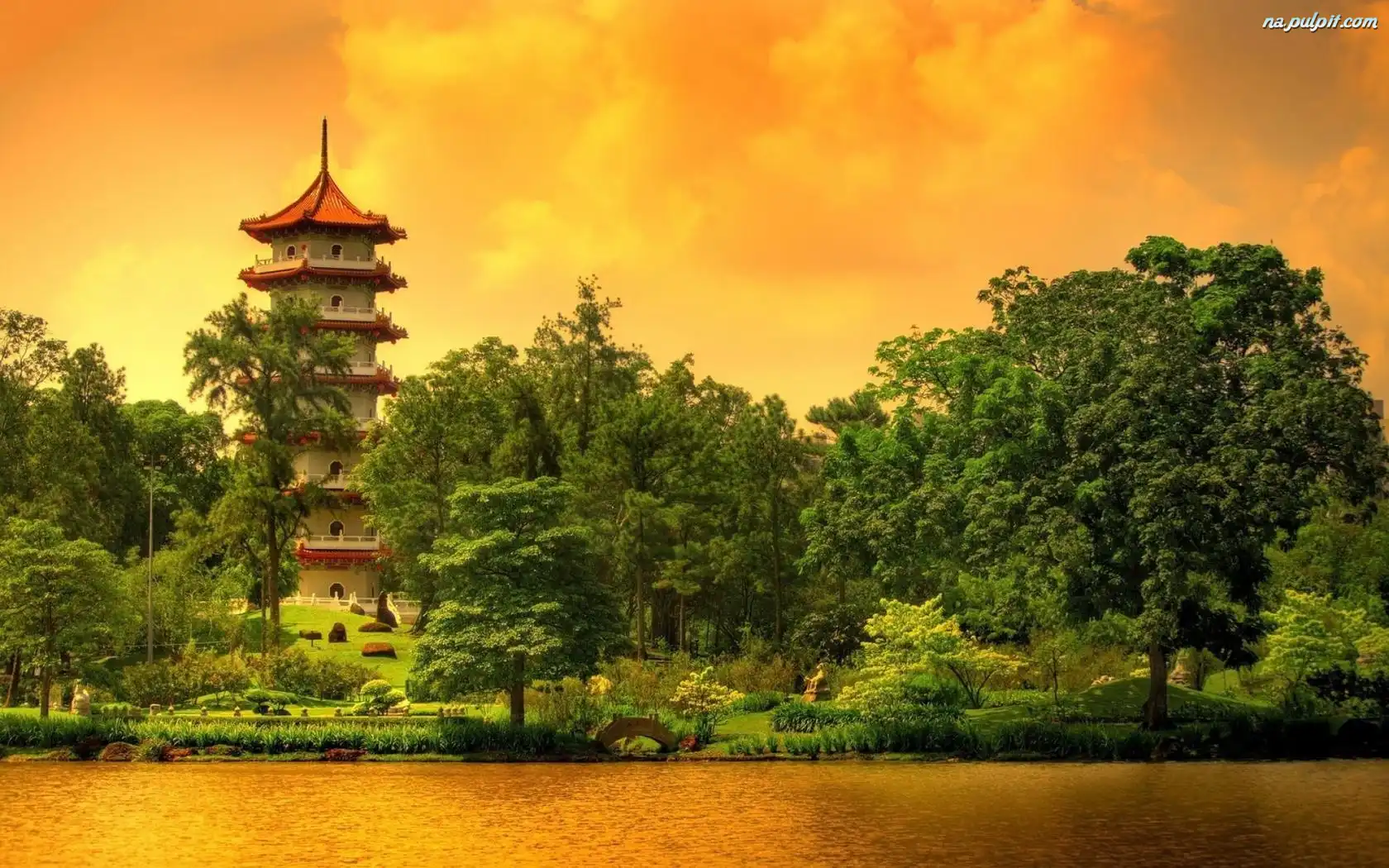 Chiny, Drzewa, Dom, Rzeka, Zachód Na Pulpit