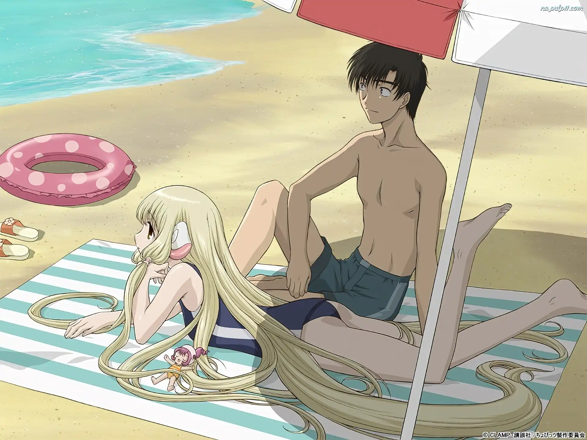 chłopak, parasol, plaża, Chobits, dziewczyna