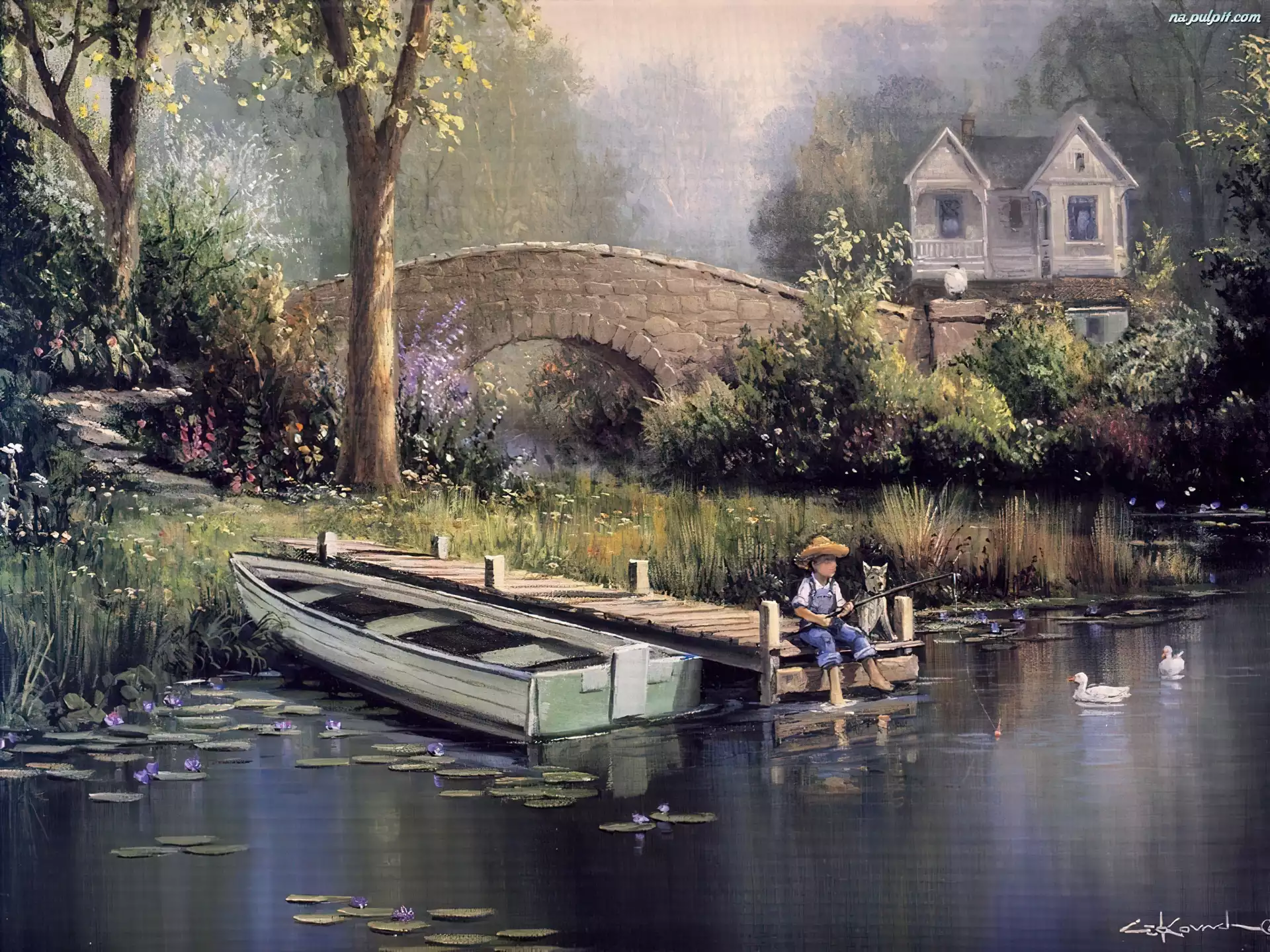 Dom, Chłopiec, Most, Wędką, Z, Pomost, Łódka Na Pulpit