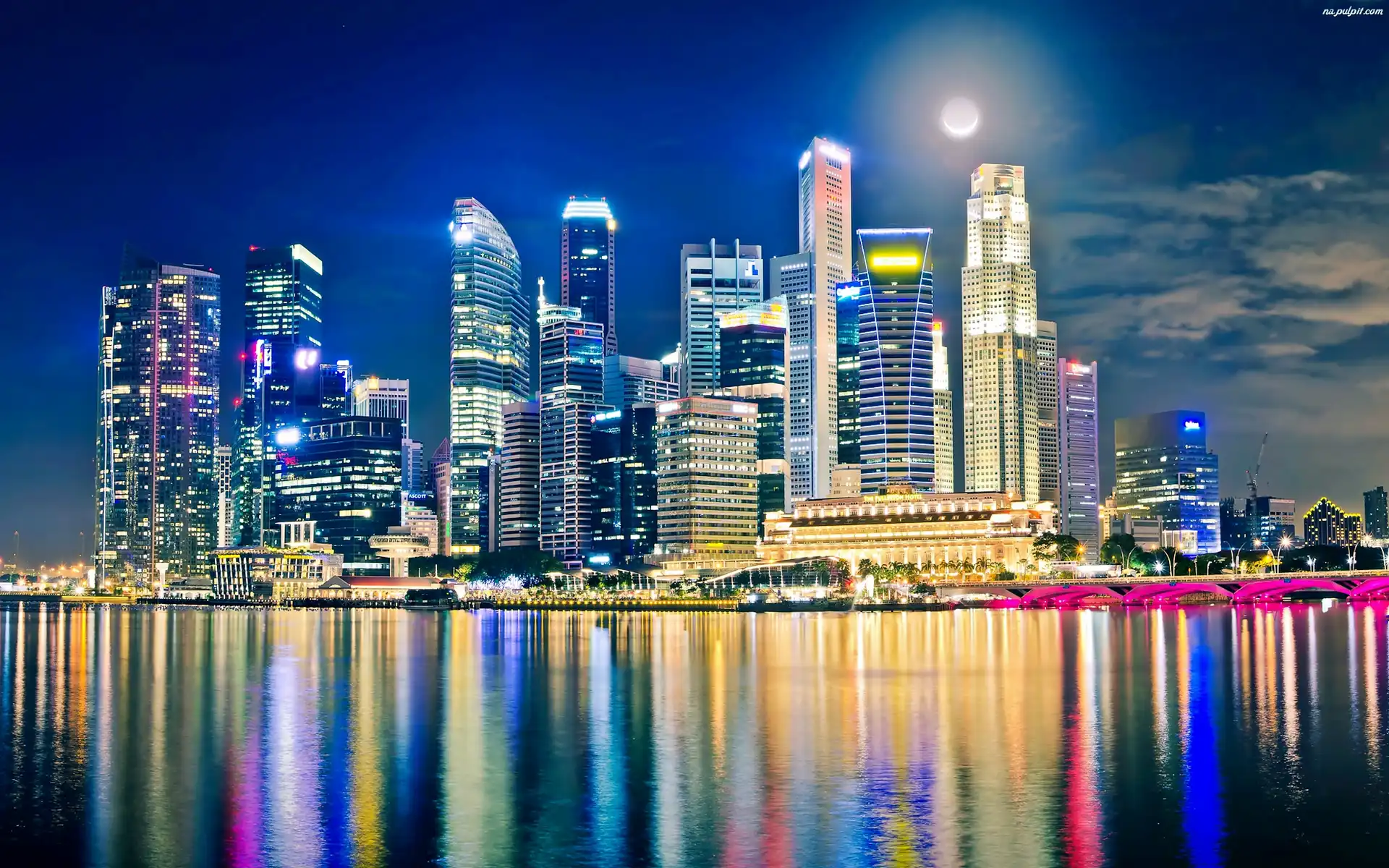 Chmur, Miasto, Nocą, Księżyc, Drapacze, Singapur