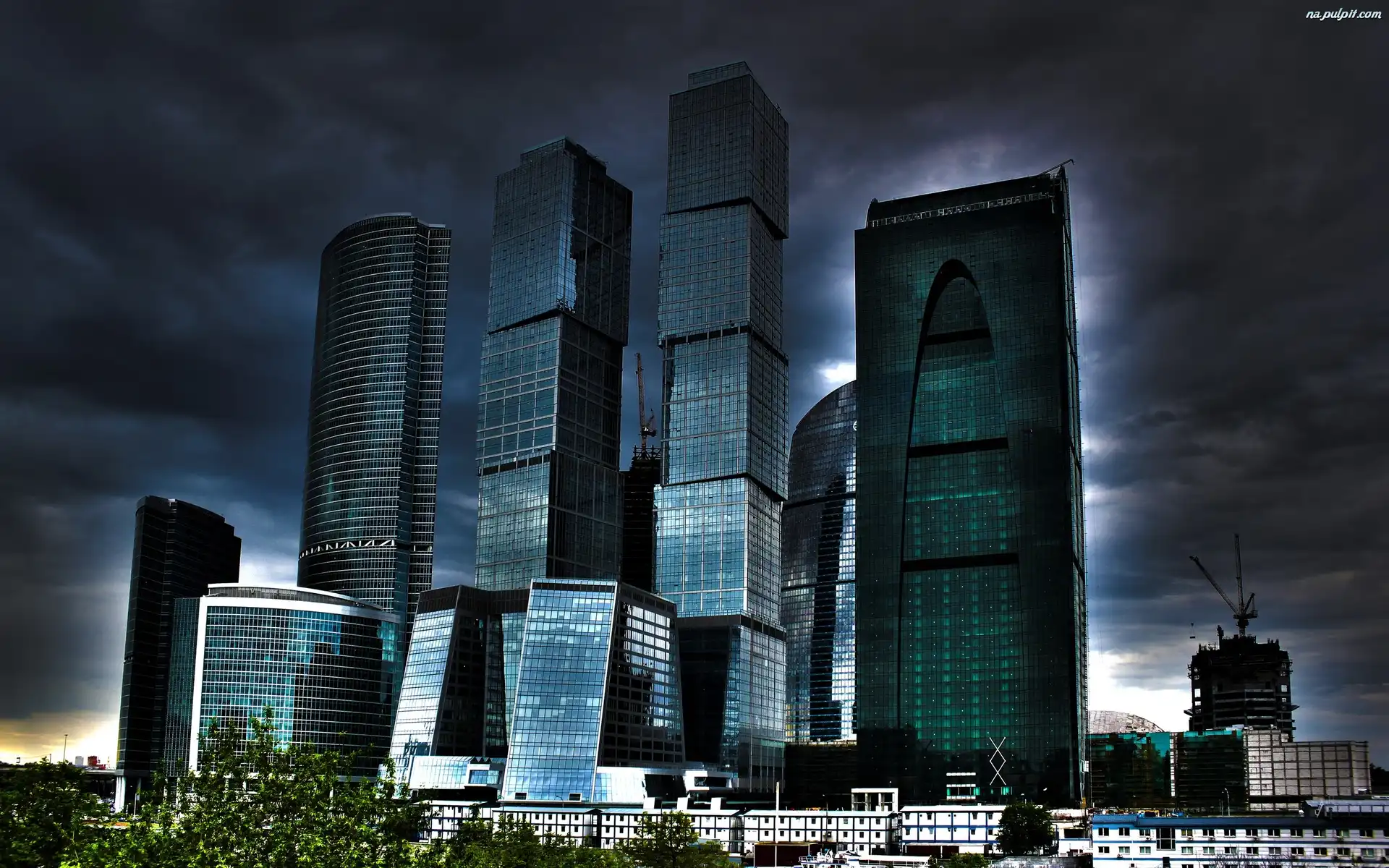 Drzewa, Niebo, Wieże, Trawnik Miasto, Taipei Chmur, Miasto, Drapacze Wieżowce, Hong Kong, Nocą Niebo, Wieżowce, Woda Chmur