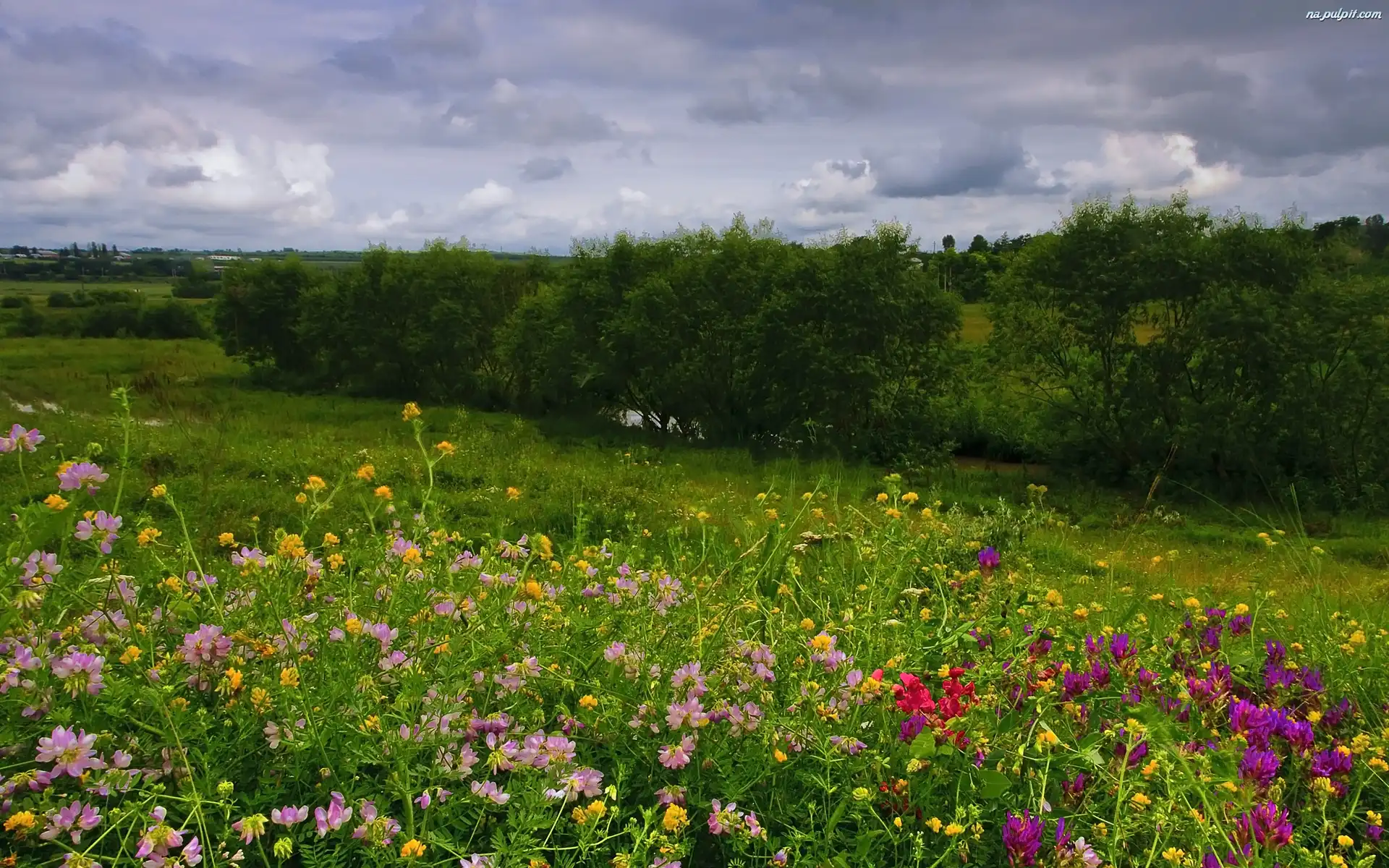 Chmury, Drzewa, Kwiaty, Łąka, Rzeka
