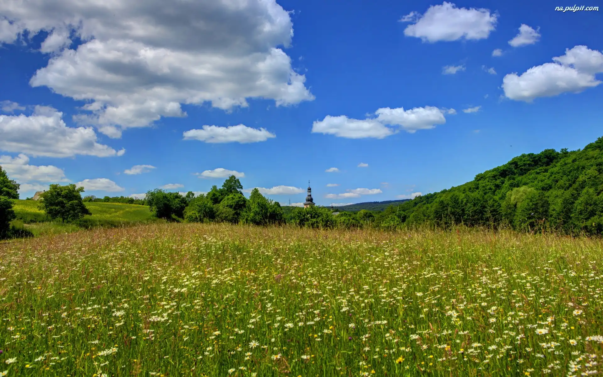Chmury, Kościółek, Kwiaty, Łąka, Lasy Na Pulpit