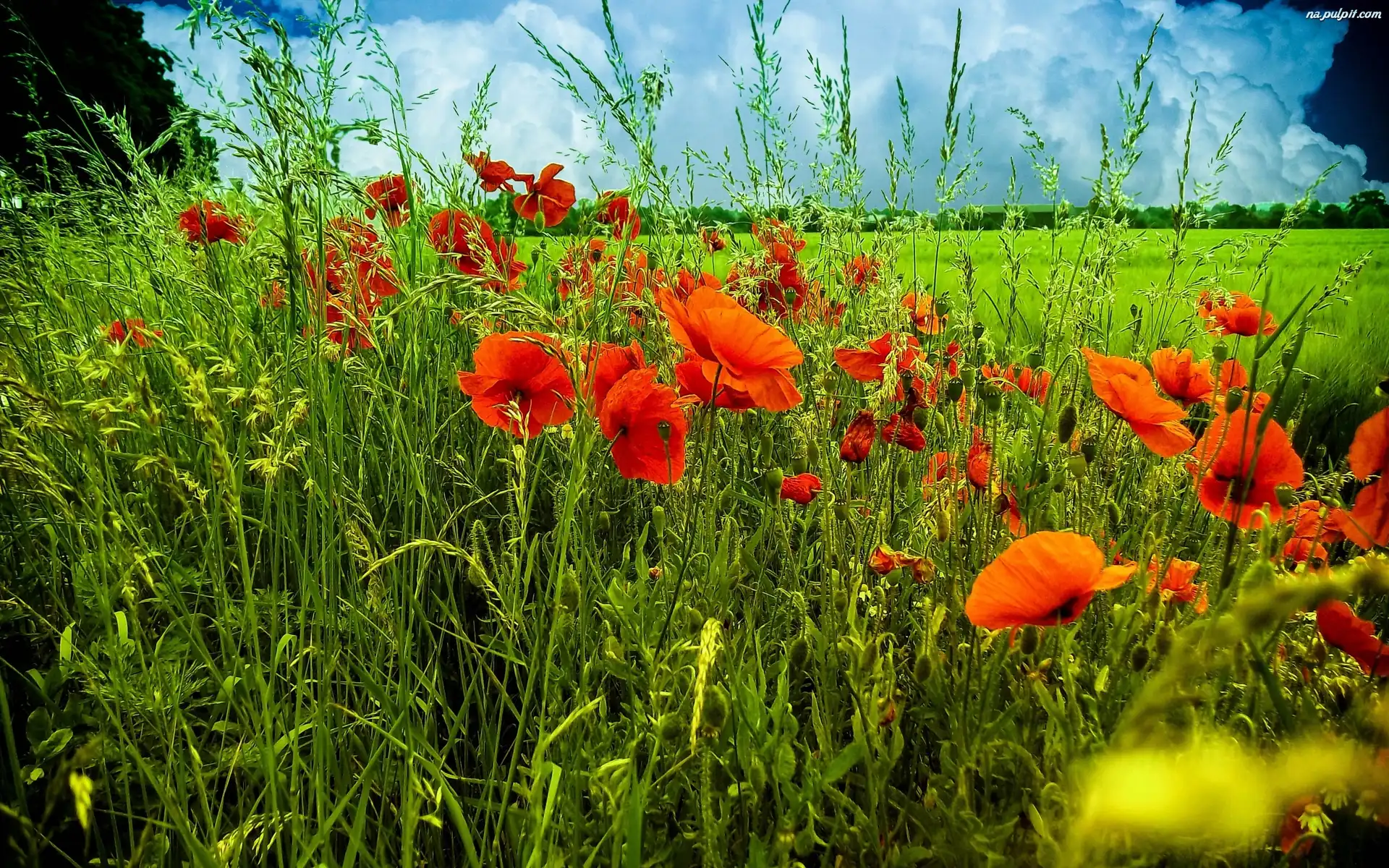 Chmury, Maki, Łąka, Trawy Na Pulpit