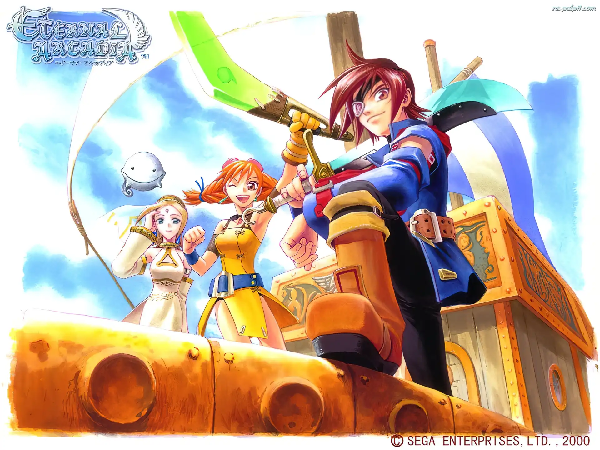 chmury, maczeta, radość, Eternal Arcadia, statek uśmiech, czaszka, flaga, Eternal Arcadia, warkocze dzieci, księżniczka, Eternal Arcadia, światła
