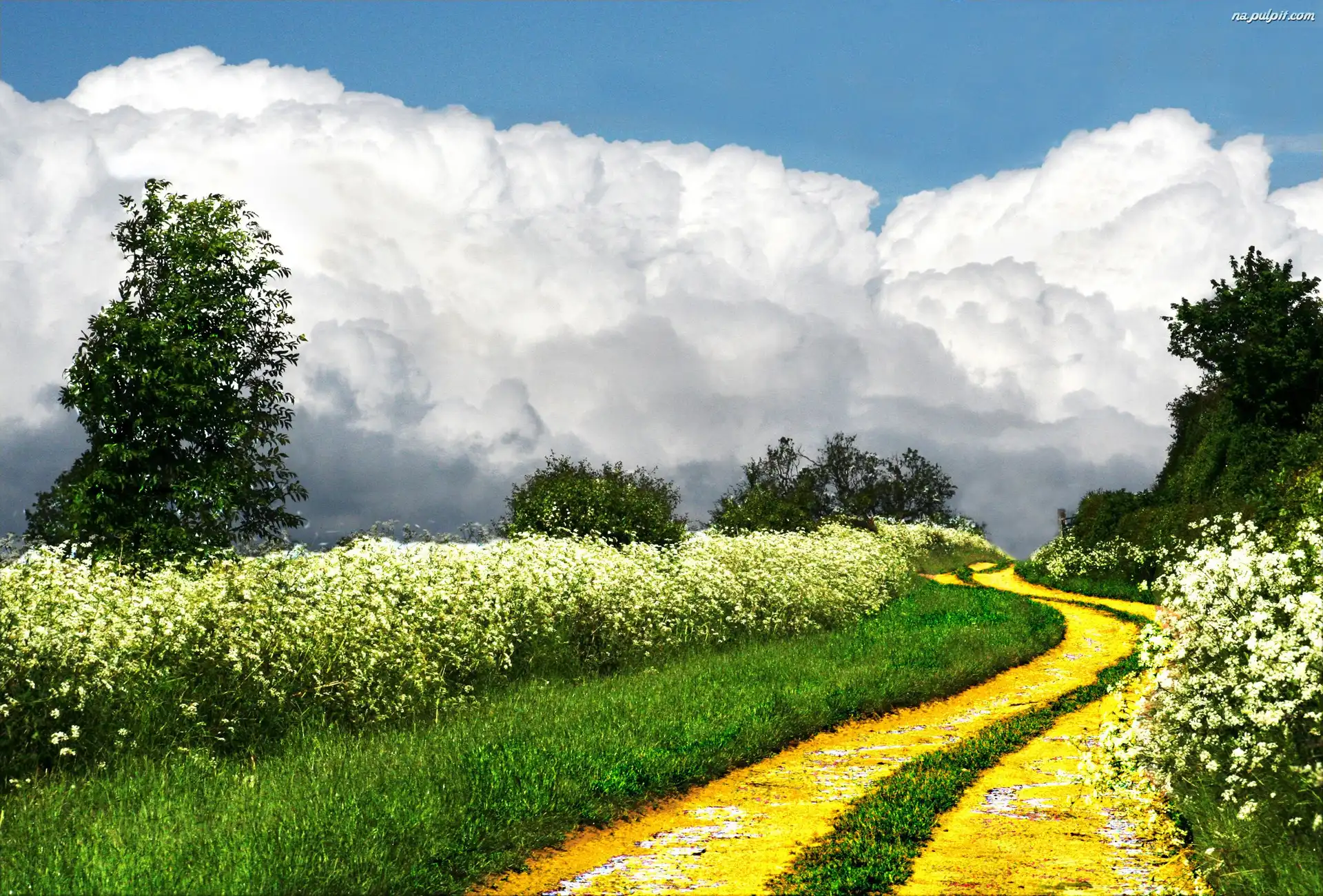 Chmury, Kwiaty, Droga, Drzewa Na Pulpit